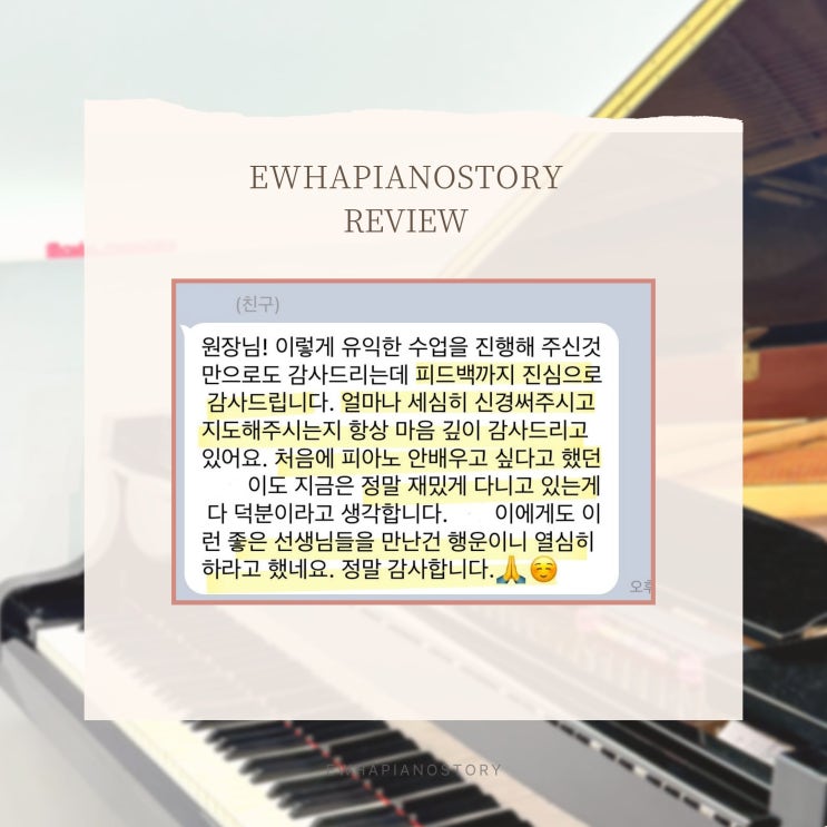 안녕하세요☺ 음악을 몰입해 배우는 과정과 연주 경험으로 아이의 마음과 실력을 함께 키우는 교육, 이화 피아노스토리 입니다. 아이들을 보내주시는 학부모님들께서 종종 남겨주시는 메세지를 보면 참 감사한 마음이 듭니다. 아이의 변화를 함께 지켜봐 주시고 메세지를 남겨 주신다는 것 자체가 저와 강사진에게는 큰 힘이 되기 때문입니다. 아이들이 피아노를 배우는 시간은 단순히 악기를 익히는 시간이 아니라 곡을 완성해 가는 과정 속에서 삶의 태도를 배워나가고, 음악을 즐길 수 있게되며, 조금씩 자기효능감과 성취감을 쌓아가는 시간이라고 생각합니다. 그래서 학부모님들께서 아이의 작은 변화를 발견해 주실 때마다 저 역시 큰 보람....... <img src="https://blogthumb.pstatic.net/MjAyNjAzMTNfMTk5/MDAxNzczMzc1MjM5OTk1.PZ6iCJYoHAP9dSz5ZXj_vzoAl4F5fl_b5CwbY9JfA9gg.fZmaO7RuKJTXakULwZNyixKeONSrOyfIBx-ibfaqLh0g.JPEG/KakaoTalk_20260306_202254875.jpg?type=s3" />