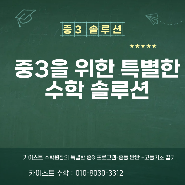 중학교 3학년은 단순히 중등 마지막 학년이 아닙니다. 이 시기는 고등학교 수학의 출발점이 되는 가장 중요한 시기입니다. 많은 학생들이 이 시기에 빠른 선행을 선택하지만 실제로 고등 수학에서 성적을 결정하는 것은 속도가 아니라 이해력입니다. 그래서 카이스트 수학에서는 중3을 위한 특별한 수학 솔루션 프로그램을 시작합니다. 이 프로그램은 단순한 선행 수업이 아닙니다. 중등 개념 완성 + 고등 수학 준비 + 개별 클리닉 관리 세 가지를 동시에 진행하는 중3 맞춤형 수학 프로그램입니다. 프로그램 구성 1️⃣ 중등 수학 과정 중학교 핵심 개념을 정확히 정리하고 고등 수학으로 이어지는 기본기를 탄탄히 만듭니다. 단순 문제 풀이가....... <img src="https://blogthumb.pstatic.net/MjAyNjAzMDVfMjk4/MDAxNzcyNzA3NjU5Njgw.kBOF7_rZbwwCdJEEtgSDuzhvxGDYuvouHy_WkJ0UWQ0g.peNin-sZdLyGSlB-3Ue1PEBzMzseUEbaXqfHHBodgqIg.PNG/2.png?type=s3" />