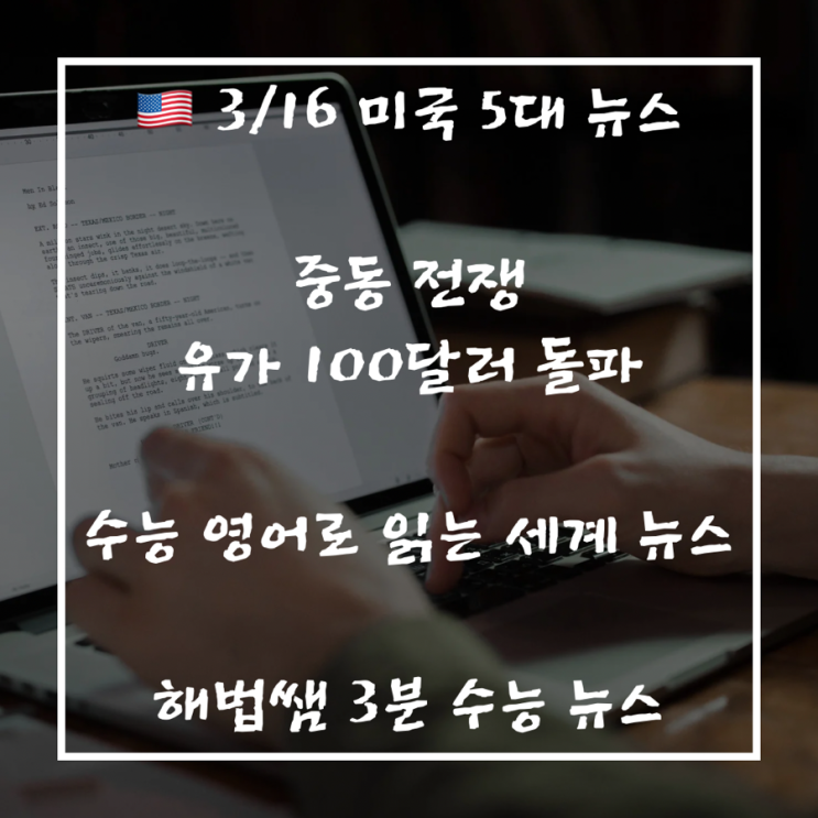 2026년 3월 16일 미국 주요 뉴스의 핵심은 미국‑이란 전쟁 긴장 확대, 국제 유가 급등, 호르무즈 해협 봉쇄 문제, 미국 대형 폭풍 피해, 글로벌 안보 갈등입니다. 이러한 국제 정치·경제 이슈는 수능 영어 독해에서 자주 등장하는 소재입니다. 실제 뉴스 문장을 통해 시사 어휘와 문장 구조를 익히며 독해력을 강화해 보겠습니다. Today’s U.S. Top 5 News 1️⃣ Strait of Hormuz Crisis Escalates Key Sentence The United States urged its allies to help reopen the Strait of Hormuz. 미국은 동맹국들에게 호르무즈 해협을 다시 개방하기 위한 군사 협력을 요청했습니다. 이 해협은 세계 석유 공급의 약 20%가 지나가는 핵심 통로입니다....... <img src="https://blogthumb.pstatic.net/MjAyNjAzMTdfMTg3/MDAxNzczNzA2OTQ4MjIz.JXinx2Xmk2BkT0EncidEM0cNpBeRzBp9GSJtRHFJMt0g.L8DCoNwDFnE8SFS0qLH3jjj85aeVF_UGJraxh-oNpNcg.PNG/%C8%F2%BB%F6%B0%FA_%B0%CB%C1%A4%BB%F6_%B1%F2%B2%FB%C7%D1_%BB%E7%C1%F8%B9%E8%B0%E6_SNS_%BA%ED%B7%CE%B1%D7_%C4%AB%B5%E5%B4%BA%BD%BA_%C5%B8%C0%CC%C6%B2_%BD%E6%B3%D7%C0%CF_%C0%CE%BD%BA%C5%B8%B1%D7%B7%A5_%B0%D4%BD%C3%B9%B0.png?type=s3" />