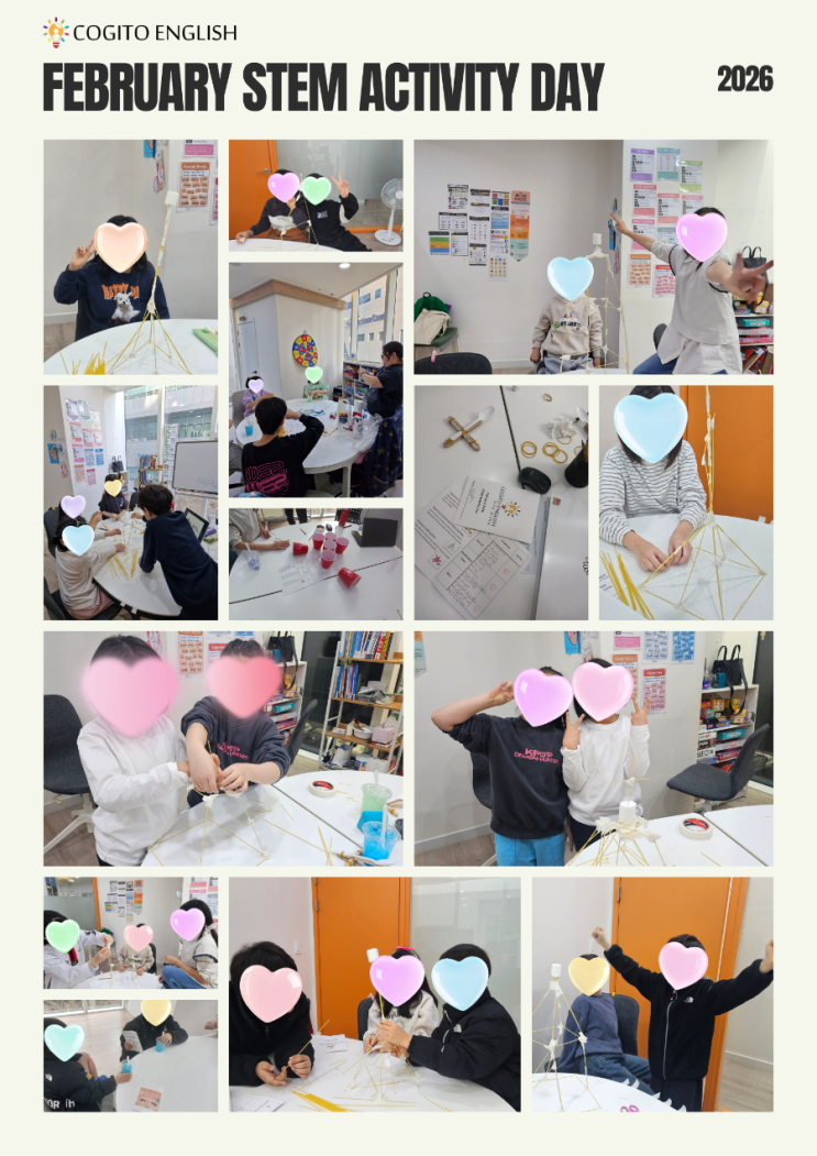 안녕하세요! 코기토 영어학원입니다 지난주 코기토 영어학원에서는 아이들이 기다리던 Activity Day가 있었습니다. 이번 달은 특별히 아이들이 제일 좋아하는 액티비티 세 가지!! (Catapult Engineering/ Marshmallow Tower/ Making Slime)를 번갈아가며 해보는 시간을 가졌습니다. Art가 없는 활동들이라 이번 달에는 STEAM이 아닌 STEM으로 명시한 이유이기도 합니다. 1. Catapult Engineering 고무줄과 아이스크림 막대, 스푼을 활용해 캐터펄트를 직접 설계하고 발사 실험을 진행했습니다. 발사 각도와 고무줄의 개수를 바꾸며 결과가 어떻게 달라지는지 관찰했습니다. 아이들은 force, motion, energy와 같은 물리 개념을 자연스럽게 접....... <img src="https://blogthumb.pstatic.net/MjAyNjAzMDNfMjc0/MDAxNzcyNDcyNDgzODk5.k2EOFE_7bl7zZiofYKj0pBVCGdy8XjWW-hPxgP4sinAg.5qFZ71EvpBz6GRZQAi4cHn56hblWchngOMsdUtVt_BMg.PNG/900%A3%DF1772459164889.png?type=s3" />