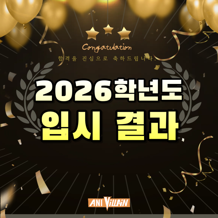 안녕하세요~ 애니빌런 만화학원 2026년도 입시 결과 안내드리려고 합니다! 대학 편입, 전공심화 영역과 예고와 애니고는 올해 처음 합격자가 나와서 더 기뻤던 한해네요! 모두 고생많았고 다시 한 번 합격을 축하합니다! 원하는 곳에서 즐거이 학업에 전념하기를 바랍니다! 감사합니다!! 미대 입시, 만화, 애니메이션 데뷔/취미! 모두 애니빌런 만화학원과 함께해요~! 양천구, 목동 애니/만화학원은 애니빌런 만화학원 입니다!! <img src="https://blogthumb.pstatic.net/MjAyNjAyMjZfMTY4/MDAxNzcyMTA4NDU1NjA0.mZLqglAEsGF63QMMOswqyWaVFbfgzO5nvQ2eIyx0jXgg.S0Bhi5FPyji-ULuFpuOcQMYfw95_MypcoGMvPWBQHiQg.PNG/2026_%C0%D4%B0%E1_%BA%ED%B7%CE%B1%D7%C7%A5%C1%F6.png?type=s3" />
