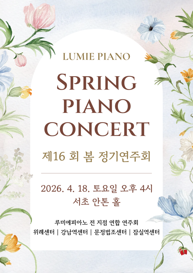 안녕하세요. 루미에피아노입니다^^ 2026년 제16 회 봄 정기연주회 안내입니다. 루미에피아노 제16 회 봄 정기연주회 2026년 4월 18일 토요일 16시 서초 안톤 홀에서 열립니다:) 전 지점 연합 연주회이니 많은 참여 부탁드립니다. <루미에피아노 상담 예약> ▼ https://linkfly.to/509139LdeHG 루미에피아노 잠실역센터 ˚ OPEN 월-토 10:00 - 24:00 일 10:00 - 22:00 (법정 공휴일 휴무) 성인 전문 체계적인 1:1레슨 무제한 연습실 이용가능 TEL: 02-412-5172 / 010-2723-5172 카카오톡 ID : lumiepiano3 TEL:02-525-5172 <img src="https://blogthumb.pstatic.net/MjAyNjAzMTFfNzUg/MDAxNzczMjMxODE3ODcz.NM1JHGLsD3EL8kTpTSmjzkYRb24epUV3EPNsFSVGBf0g.iqWUtZiaftn_4V0rjUP3wA-Jdlv8_5ih5JrqeIEdYK0g.PNG/%BA%BD_%C1%A4%B1%E2%BF%AC%C1%D6%C8%B8_%C6%F7%BD%BA%C5%CD_%283%29.png?type=s3" />