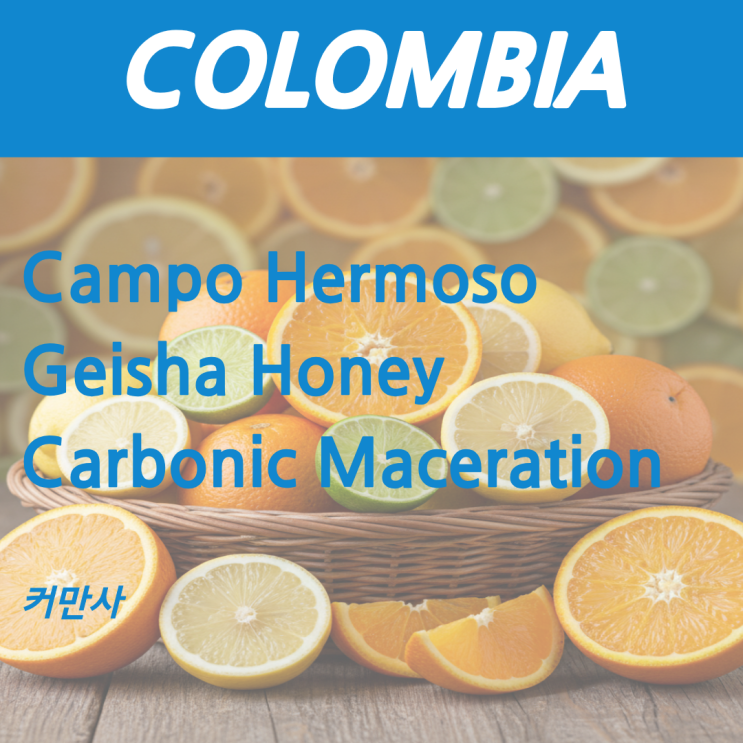 2026.03.03 커만사 Colombia Campo Hermoso Geisha Honey Carbonic Maveration 생두 정보 ● Flavor Summary ● 콜롬비아 캄포 에르모소산 게이샤 허니 카보닉 머서라이즈드 커피는 향긋한 라벤더의 꽃향기, 레몬과 라임의 시트러스 향, 달콤한 크랜베리, 그리고 허브향이 어우러진 커피입니다. (출처: 커만사 홈페이지) 커핑 정보 안녕하세요! 개금바리스타학원입니다. 오늘은 콜롬비아 캄포 에르모소 게이샤 허니 카보닉 머서라이즈를 가지고 왔습니다. 카보닉 머서라이즈 가공방식은 무산소 발효의 유형이라 볼 수 있는데요, 이산화탄소 탱크에서 발효해 과일이라던지 향미를 극대화까지 끌어올리는 커피라고 볼 수도 있는 방식입니다. 생두를....... <img src="https://blogthumb.pstatic.net/MjAyNjAzMDJfMTEx/MDAxNzcyMzc3ODAwMzQ0.liLBvErPf1cmNzc-WI7MgJi_ApuANw_9PN-Lr-2Ib_wg.3D5gqKT_Ht785wgt0oVPBei4fpoGVh4W-sFYFv09L0og.PNG/%C1%A6%B8%F1%C0%BB_%C0%D4%B7%C2%C7%D8%C1%D6%BC%BC%BF%E4..png?type=s3" />