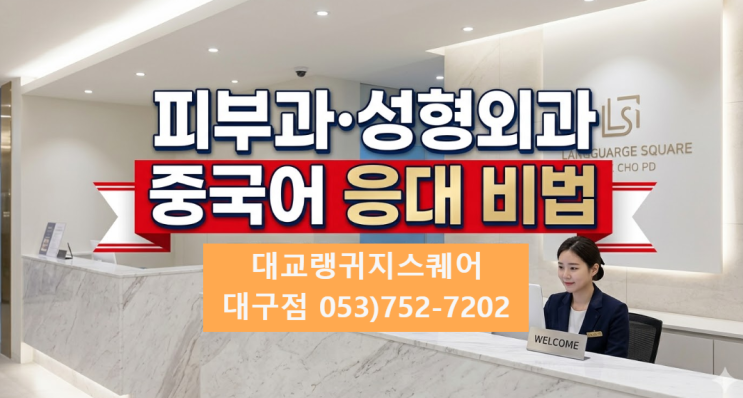 #병원중국어 #피부과중국어 #성형외과중국어 #대교랭귀지스퀘어 #대구중국어과외 닌하오! 안녕하세요^^ 최근에 피부과를 찾는 중국인 고객이 많이 늘어나는 분위기지요~? 사실 대부분의 사람들이 그렇겠지만, "중국인 고객의 '재방문율'을 결정짓는 것은 화려한 인테리어가 아니라, 나를 이해해 주는 '한 마디'입니다! 중국인 고객 응대, 생각보다 어렵지 않습니다! 원래도 많았지만, 요즘 피부과나 성형외과에서 중국인 고객을 만나는 경우가 점점 많아지고 있습니다. “영어도 잘 안되는데 중국어까지 해야 하나요…?” 네! 당연하죠! 병원 중국어는 따로 배우는 것이 좋습니다. 간단한 상담만 가능해도 ✔ 고객 만족....... <img src="https://blogthumb.pstatic.net/MjAyNjAzMTZfODEg/MDAxNzczNjM2Nzk2NDg5.J89IlzZTSu3I1ljnlWhD_90SWnbEmjyFNuE7scOQUqAg.j3VU6HbuIdNeJKDmBkKBNHRKb4unxfCoLJZbF9QlLXkg.PNG/image.png?type=s3" />