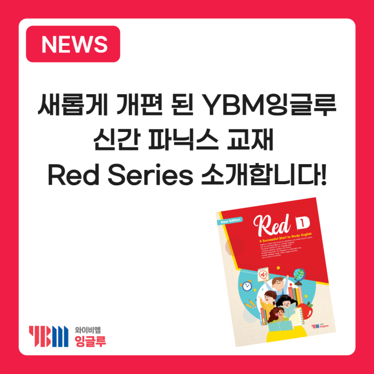 안녕하세요, YBM잉글루입니다! YBM잉글루의 기존 파닉스 교재가 ‘Red Series’로 새롭게 개편되었습니다! Red Series는 기존 8권 과정으로 운영되던 파닉스 교재를 6권 과정으로 재구성해, 학습 흐름을 보다 간결하고 체계적으로 정리한 신간 파닉스 시리즈입니다. 시리즈명도 기존 ‘Phonics’에서 ‘Red’로 변경되었으며, 학습 단계 재구성, 학습 순서 조정, 문제 유형 보완, 부가자료 강화 등 전반적인 개편이 함께 반영되었습니다. 이번 Red Series는 파닉스 입문 단계에서 꼭 필요한 핵심 음가를 보다 반복적이고 체계적으로 익힐 수 있도록 구성된 것이 특징입니다. 기존 과정에서 반복되던 일부 요소는 정리하고, 목표 음가 중심으로 학....... <img src="https://blogthumb.pstatic.net/MjAyNjAzMjBfMjky/MDAxNzczOTY5NDAxNjQ4.JY1bxLIu_zTkcn_-u9-l1ehsOAFd-iivHWbTsl_pxu8g.W_S-oDzUnIExFg9jLUAk4Tusn_SxWYSAAkHMcvAWZXUg.PNG/%BA%B9%BB%E7%BA%BB_%BD%E6%B3%D7%C0%CF_%2815%29.png?type=s3" />
