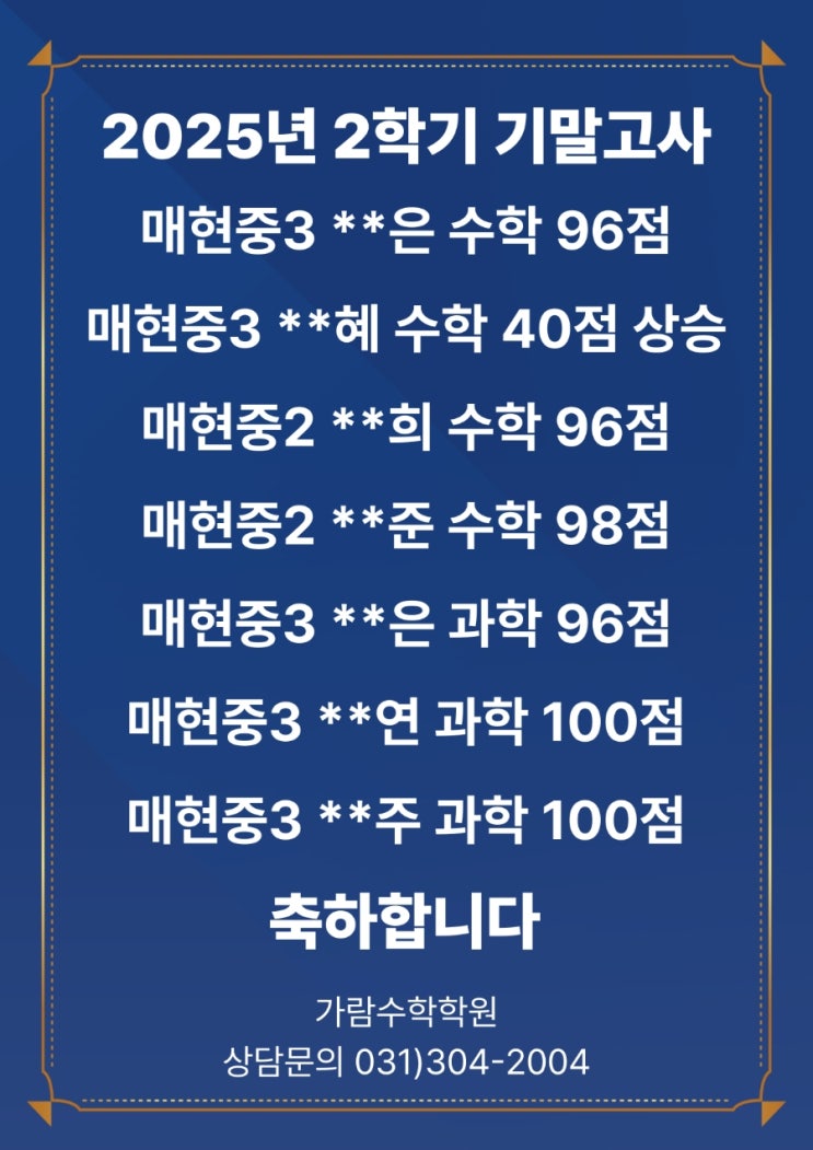 안녕하세요, 가람수학학원입니다. 기말고사가 모두 마무리되었습니다. 매현중학교 수학 시험은 최근 들어 난이도가 계속 높아지고 있습니다. 코로나 이후 비교적 쉬웠던 문제들에서 벗어나 서술형 문항이 다시 출제되고, 풀이 과정이 까다로운 문제들도 점점 늘어나고 있습니다. 이제는 유형을 단순히 암기하는 방식으로는 문제를 해결하기 어려운 시험이 되고 있습니다. 개념을 정확히 이해하고, 논리적인 풀이 과정을 통해 문제를 해결하는 힘이 반드시 필요합니다. 가람수학학원에서는 개념을 탄탄하게 이해한 뒤 빠르고 정확하게 문제를 풀 수 있도록 지도하고 있습니다. 이번 시험이 어려웠음에도 불구하고 좋은 성적을 받아온 아이들, 정말....... <img src="https://blogthumb.pstatic.net/MjAyNTEyMTdfMjM0/MDAxNzY1OTM1OTEwNzk4.w8wy4Jt1ozei5bIOFG33WelbXn5zLTtEQeNnNWdoh48g.P0QNJVEbDI2-MvAirmSPC5MBrtapPuVB0_WyUEY4mV0g.JPEG/900%A3%DF1765895298640.jpg?type=s3" />