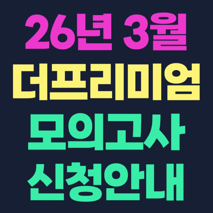 안녕하세요. 영통관리형독서실 사자관리형독서실입니다. 26년 대성 더 프리미엄 모의고사 일정입니다. 우리는 대부분이 재학생이므로 시행날짜에 시험을 보지 않고 시험이 있는 그 주 주말에 시험을 실시합니다. 사자교육 재원생 및 비재원생도 신청이 가능합니다. 아래 3월 신청 안내를 참고해주세요. ▶ 26년 3월 대성 더 프리미엄 모의고사 신청 안내 대상 : 고3학생 및 재수생 시험실행일 : 3월 22일 일요일 모의고사 신청 기한 : 3월 8일 저녁 8시까지 신청 방법 : 1) 사자관리형독서실 / 사자수학 재원생 : 개별 단톡방으로 신청 2) 비재원생 : 010-9375-0483으로 문자 신청 신청 비용 : 1) 사자관리형독서실 / 사자수학 재원생 : 25,000원....... <img src="https://blogthumb.pstatic.net/MjAyNjAzMDZfMTAg/MDAxNzcyNzg2NjQzODgw.hW0YNJGpNNDEIQaxQhFoUniEtONgGjo-JBeu0aVPvIog.oMY2PFjGxYzv_J050K-lg1ERetKM1HYlpnDFADWUfP8g.PNG/%BF%B9%BA%F1%B0%ED3_%BC%F6%B8%AE%B3%ED%BC%FA-004_%281%29.png?type=s3" />