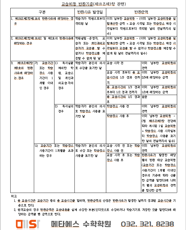 교습비 반환 기준