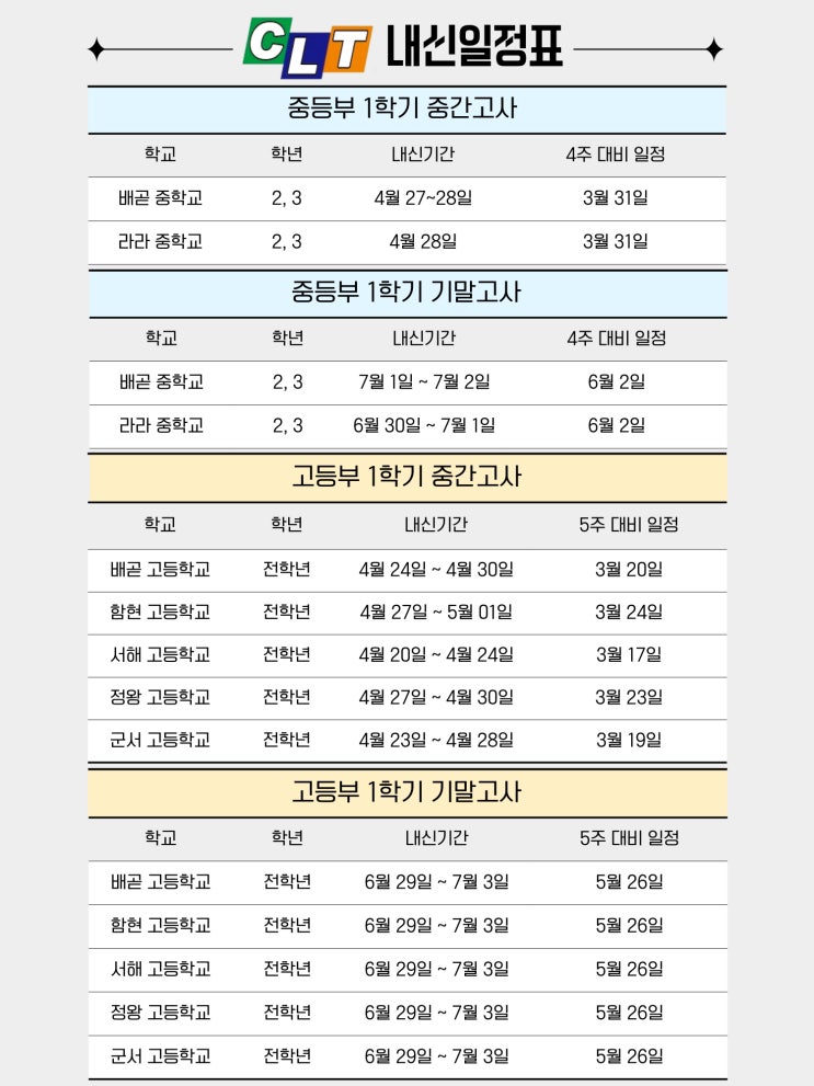 안녕하세요. 배곧에서 고등 영어를 지도하고 있는 배곧 고등영어학원 CLT입니다. 중, 고등학교는 시험 일정에 따라 학습 계획이 크게 달라집니다. 아이들이 미리 준비할 수 있도록 1학기 내신 시험 일정을 정리해 공유합니다. 시험 대비는 보통 시험 4~5주 전부터 시작됩니다. 일정을 미리 확인하고 학습 계획을 세우는 것이 중요합니다. 아래는 2026년 1학기 내신 일정표입니다. 학생들과 학부모님들께 도움이 되길 바랍니다. 상담 문의 및 위치 안내 031-432-0509 (문자가능) #배곧고등영어학원 #배곧영어학원 #배곧고등학교내신일정 #배곧1학기내신일정 #배곧고내신 #정왕고내신 #서해고내신 #함현고내신 #군서고내신 #군서고내신일정 #배곧고....... <img src="https://blogthumb.pstatic.net/MjAyNjAzMTFfMjMx/MDAxNzczMjIzNTcxMjQ2.W5Z1UHSB8qyXud75BtFIKQbRSq6qfwpbhGTfA-54Hxcg.fiW1uP11FWY6G-pa5e2brfLUFSaC0c4R_dsAIX4fgIog.JPEG/1%C7%D0%B1%E2_%B3%BB%BD%C5%C0%CF%C1%A4%C7%A5.jpg?type=s3" />