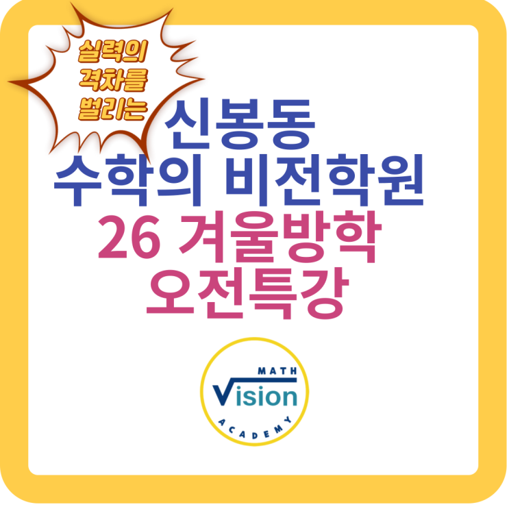 실력의 격차를 벌리는 신봉동 홍천초 근처 수학학원 2026 겨울방학 오전 특강을 안내합니다. 푸른 뱀의 해 2025 을사년이 얼마 남지 않았습니다. 해마다 이맘때 즈음이면 연초에 생각했던 목표들을 이룬 친구들도 있겠지만 아쉬움이 많은 학생들이 더 많을 거라 생각이 됩니다. 곧 길고 긴 겨울 방학이 시작될 것이라 생각하면 특히나 중학교 입학을 앞둔 예비 중 학부모님들은 아마도 마음이 조급하고 불안하실 것입니다. 약 2개월간의 시간들을 어떻게 하면 알차게 보낼 수 있을지 고민이 많으실 것 같습니다. 저 역시 원장이기 이전에 엄마이기에 같은 고민을 했던 경험이 있답니다. 몰입학습으로 실력의 격차를 벌릴 수 있는 최적의 골든타임....... <img src="https://blogthumb.pstatic.net/MjAyNTEyMTRfMTM2/MDAxNzY1Njk5NTQwMDM2.BXXcp41xDBN5g5uz7w8kCrSJsbLAF_iNR1RzTD4Isq4g.HIh_YeiRKwe49bCJb35w0GfJ7PkZ3r0_MgpyoPoovcgg.PNG/%C1%A6%B8%F1%C0%BB-%C0%D4%B7%C2%C7%D8%C1%D6%BC%BC%BF%E4__%BA%B9%BB%E7%BA%BB-_2_-001_%282%29.png?type=s3" />