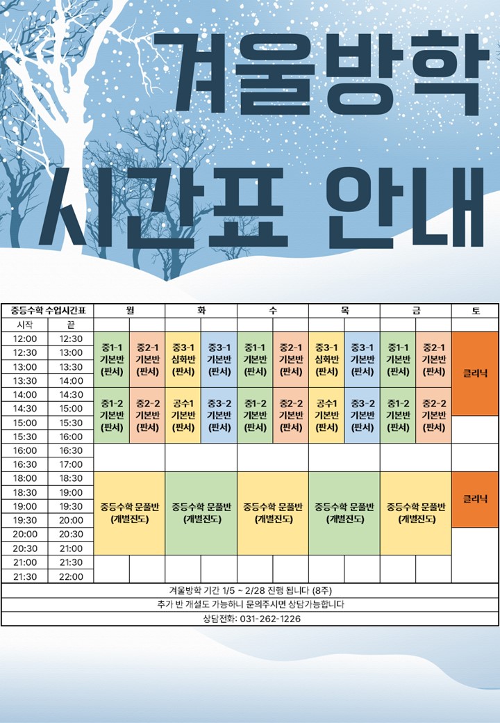 추운 겨울 가내 평안 하시기를 기원합니다. ♥ 시험기간 중에 있지만 미리 겨울 방학 커리큘럼 안내드리오니 학생들 학사 일정에 참고하시기 바랍니다. 궁금하신 사항은 전화주시면 친절히 안내 드리겠습니다. ● 지평수학학원 겨울커리큘럼 ▶ 중등부 수업 조합(예비고1 제외 ) ①(정규) + ④(특강) 또는 ②(정규) + ③(특강) 정규수업과 특강을 같은 요일에 선택하면 시간이 길어 능률이 저하될 수 있으니 크로스로 선택을 권장합니다. ▶예비고1(현중3) 수업 ⑤(정규) + ⑦(특강) 또는 ⑥(정규) +⑦(특강) 예비고1중 대수를 희망하는 학생은 ⑤(정규) + ⑨(특강) 또는 ⑥(정규) + ⑧(특강) ▶예비고2(현고1) 수업 ⑧(정규) + ⑩(특강) 또는 ⑨....... <img src="https://blogthumb.pstatic.net/MjAyNTEyMTFfNzUg/MDAxNzY1NDM4NzkxMzYw.z7AABTwKzVexK_j1nIFKnMJ6fgOzCTxob5_34wSWGdQg.zGA_0nr1NBoK86XpF6NaX2pqRMIlpA9fsQ0MMFuf6Ywg.JPEG/%EC%A7%3F%3F%8F%89%EB%A1%9C%EA%B3%A0.jpg?type=s3" />