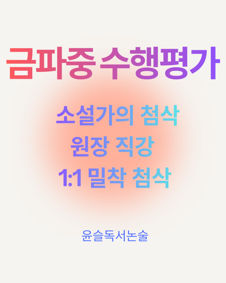 안녕하세요. 금파중 학생들의 문해력 지킴이 윤슬독서논술입니다. 새 학기, 금파중학교 학부모님들의 가장 큰 고민은 단연 '수행평가'입니다. 지필평가만큼 비중이 커진(30% 이상) 수행평가는 이제 단순한 숙제가 아닌, 수업 시간 내 실전 글쓰기로 판가름 납니다. 지필은 만점인데 수행평가에서 감점되는 아이들, 그 해답은 바로 죽어가는 글에 숨을 불어넣는 ‘한 끗’의 차이에 있습니다. [문학] 단어 하나로 숨을 불어넣는 마법 문학 수행평가(서평, 수필 등)에서 아이들의 글에 작가의 별거 아닌 tip이 문장을 살립니다. 1) 리듬감없이 단조로운 글에 '버스'라는 단어를 넣어 글에 리듬을 만듭니다. 2) 신호들에서 붉은....... <img src="https://blogthumb.pstatic.net/MjAyNjAzMDNfMTgw/MDAxNzcyNTM2NDY4NjY4.tyLVBOCPsRaTXRUjwIHXfHkjuNRbN7MSI2H1BeTftoIg.AUD2uZiva1RwHW2epdvgROKm7AaJ5K28N1nkcIARy3og.PNG/%BC%F6%C7%E0%C6%F2%B0%A1%BD%E6%B3%D7%C0%CF.png?type=s3" />