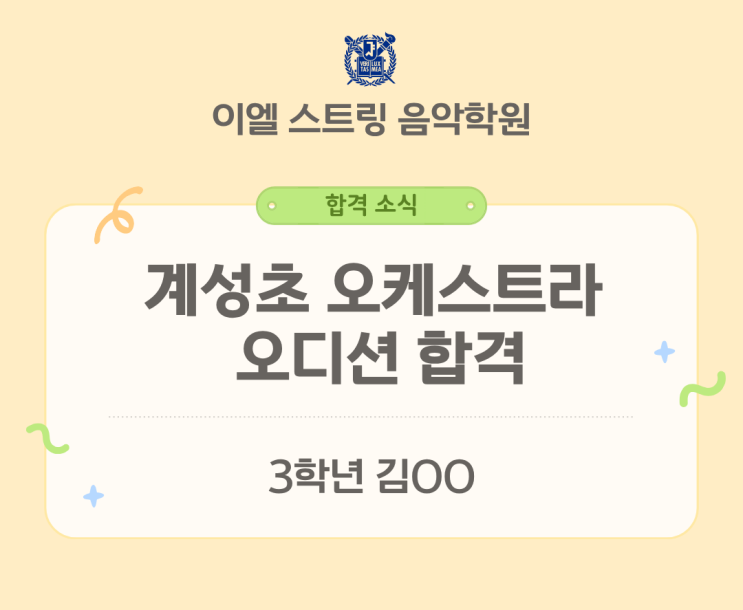 이번 주 이엘 스트링에 기쁜 소식이 도착했습니다~ 우리 학생이 열심히 준비해오던 학교 오케스트라 오디션에서 좋은 결과를 받았어요! 오디션 합격을 축하해요! 첼로에 대한 열정 많은 우리 학생 연습하느라 수고 많았어요! 앞으로도 차근차근 성장해 나가길 응원합니다 ♡ <img src="https://blogthumb.pstatic.net/MjAyNTExMjhfMTQw/MDAxNzY0MzAwODUxMjYx.Ckx1cHgpxQ7Dn8LInPX5F9aG3lriFwCd86V-Sr7MYo4g.9xWErls1-96f01miBSo27BsxmtpeM1PO7fRLtRaJIIYg.PNG/%C1%A6%B8%F1%C0%BB_%C0%D4%B7%C2%C7%D8%C1%D6%BC%BC%BF%E4..png?type=s3" />