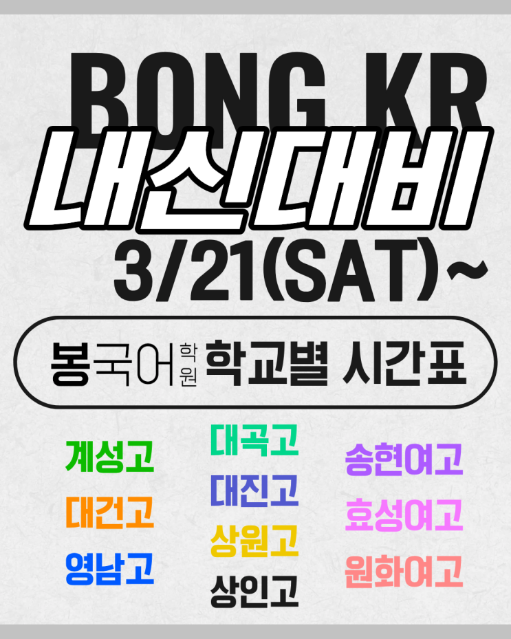 안녕하세요, 봉국어학원입니다. 2026 봉국어 고등부 학교별 내신 시간표 안내 드립니다. 저희 봉국어 내신 대비반은 주 1회 3시간 집중 수업으로 6주(+@)간 체계적으로 진행됩니다! 학교별 출제 경향을 반영한 자체 제작 자료집과, 매주 복습 테스트를 통해 학습 내용을 꼼꼼히 점검합니다. 또한 학교·학년별 단톡방을 운영하여 담당 선생님과 실시간 소통이 가능해, 수업 외 시간까지 밀착 관리가 이루어집니다. 2026 고1 내신대비 확정 시간표 2026 고2 내신대비 확정 시간표 봉국어학원 내신대비 체계적인 관리로 완성하는 내신 지금 시작하세요! 다음으로 내신기간 관련해 많이 물어보시는 질문 Q&A를 끝으로 안내 마치....... <img src="https://blogthumb.pstatic.net/MjAyNjAzMDFfMTUy/MDAxNzcyMzMzMTcyMjMx.q-KPdOhFLv5ecnmdlVES9I7fEdtul337vs5-o9gCJUUg.kWeOFJpIC9AY4D3Ur63s-AfYFklotDg6Vt4_X65eD4wg.PNG/3.png?type=s3" />