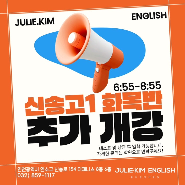 신송고1 화목반이 재원생들로 마감이 되었고, 대기생들도 생겨 추가 오픈하게 되었습니다. 현재 신송고1은 화목 두반, 월수 한반으로 총 3반입니다. :-) #신송고 #영어학원 #송도줄리킴 #줄리킴영어 #고등부영어 #신송고등학교 #송도고등학교 <img src="https://blogthumb.pstatic.net/MjAyNjAyMjdfMTAz/MDAxNzcyMTYzMjk0NjU1.7-m4SIWaz4sFkocW4oO6YqnUhXmN8AUrzLxJGTHO6kMg.9h1l6R1bHQCPpd3JSbephuk2BAMpIA4udHL41H5KD0Mg.JPEG/IMG%A3%DF4096.JPG?type=s3" />