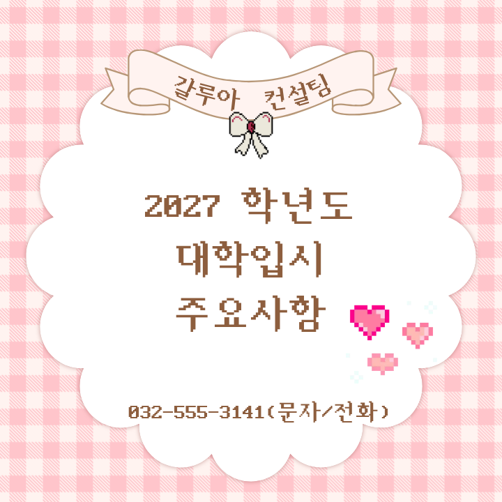 2027학년도 대학입시는 수시 80%, 정시 20% 구조 유지, 의대 정원 확대, 그리고 2015 개정 교육과정의 마지막 수능 세대라는 중요한 특징을 가지고 있습니다. 특히 2028학년도부터 수능 체계와 내신 평가 방식이 크게 바뀌기 때문에, 올해 입시는 많은 수험생들에게 매우 중요한 기회가 될 것으로 예상됩니다. 또한 학생부교과·학생부종합전형 모집 인원이 증가하고, 대학별 전형 방식도 계속 변화하고 있어 정확한 입시 정보와 전략적인 준비가 무엇보다 중요합니다. 이번 글에서는 2027학년도 대입 주요 일정과 변화된 입시 특징을 정리해 보겠습니다 1. 2027학년도 대입 전체 일정 정리 2027학년도 대학입시는 2026년 9월 수시 원서접수로 시....... <img src="https://blogthumb.pstatic.net/MjAyNjAzMThfMTEw/MDAxNzczODAyMDQ2MjI5.eQ2HJDJqZy-pJIIJsI5zIKdYrIFh1otizjTl3v7Yta0g.KTnQr891aP-RiE5Qfk1EtJTpsGL-XkJARnVD1tA8wksg.PNG/image.png?type=s3" />