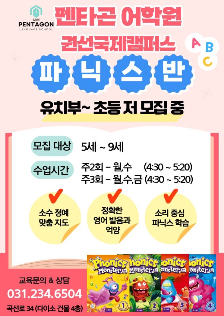 5~9세 영어 시작, 펜타곤어학원 파닉스반 모집 (권선국제캠퍼스)