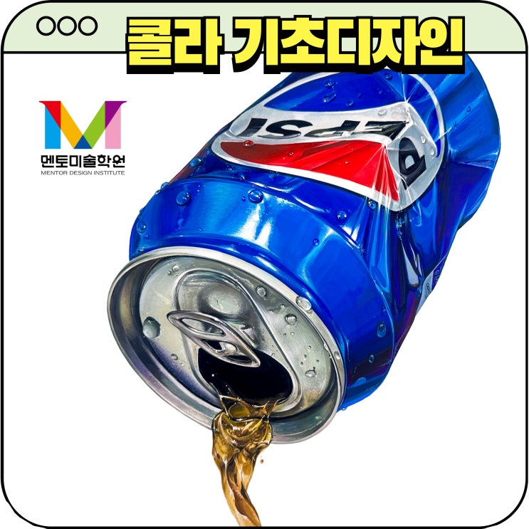 콜라 기초디자인 캔 표현 / 금속 표현 / 액체 표현 안녕하세요 여러분~! 광교미술학원 멘토미술학원입니다. 오늘도 돌아온 멘토미술 개체묘사 자료 시간! 개체묘사 자료의 모든 그림들은, 광교미술학원, 멘토미술학원 선생님들의 엄청난 정성이 들어간 자료입니다. 저희 그림을 타 학원 커리큘럼으로 쓰지 말아 주세요. ※ 무단 배포 금지 ※ 오늘은 콜라 기초디자인 표현을 배워봅시다 ✿ 콜라 캔 안에 액체가 들어있기 때문에, 캔을 따서 안에 있는 액체를 연출해주는 것도 중요한 포인트인데요! 입구에서 나오는 액체 뿐만아니라, 겉에 생기는 방울까지 디테일하게 묘사해준다면 더 좋겠습니다. 쨍한 색감의 펩시 콜라 표현, 바로 완성작부터....... <img src="https://blogthumb.pstatic.net/MjAyNjAyMjhfMTAx/MDAxNzcyMjY3NDk3NzIw.DuaTuiLIJVm6HXI30MHCO3sAoN56ZUGEwu9gsUCCnIIg.uc8reXWrwytJD5yYYgHgVHwTjEIdgAmr__-LKuIOnmcg.JPEG/%BA%ED%B7%CE%B1%D7-%B4%EB%B9%AE-001_%284%29.jpg?type=s3" />