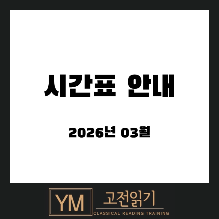 YM고전읽기 정보 및 링크 모음 카카오톡 채널 추가 로 YM고전읽기의 소식을 받아보세요. http://pf.kakao.com/_uxgZxan 전화상담 및 문의 환영합니다. 수업 등의 사유로 전화연결이 원활하지 않을 수 있습니다. 카카오톡 메시지 남겨주시면 확인 후 연락드리겠습니다. ☎️ 전화상담: 010-7917-2033 카톡상담: http://pf.kakao.com/_uxgZxan/chat ️ 서울 성북구 동소문로 66, 5층 <img src="https://blogthumb.pstatic.net/MjAyNjAyMjhfMTM2/MDAxNzcyMjQ0MTc0NzQz.GuB4llQmD-QwQqDok8QNo47p6Fvvii41G5xjBJoQyeog.P5foghXpGuSbsm6MuTiR6rFfI0Kz6r1NMQvZ4YdswDog.PNG/%BD%C3%B0%A3%C7%A5%BE%C8%B3%BB202603.png?type=s3" />