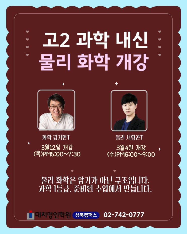 물리·화학 내신대비반 개강 개념 완성부터 1등급 실전까지 ✅개념은 정확하게, ✅문제는 집요하게, ✅시험은 완벽하게. 단순 암기가 아닌 “출제 포인트를 읽는 수업” 지금 시작하는 학생이 결국 앞섭니다. 물리 : 서형곤T 개강: 3/4(수) PM6:00 화학 : 김기현T 개강: 3/12(목) PM5:00 ☎ 수강 예약/문의 ☎ ▶ 02-742-0777 [성북] ▶ 010-3664-0773 (문자) ※ 문자 예약시 학교, 학년, 이름 필수 ◆ 고2 시간표 바로가기 ◆ https://zrr.kr/1ad3Lb ♥ 대치명인 성북캠퍼스 오시는길 ♥ <img src="https://blogthumb.pstatic.net/MjAyNjAyMjhfMTkx/MDAxNzcyMjc0OTgzODYz.UR68RHRreGa9QLa5seRd46ux2nCSvrQk7TJmYmEzBXwg.tSUwelr0yeeOJ1nsCJ8BiSQr6-7aeyOfdxiUBnDyqdIg.JPEG/%B9%B0%B8%AE%C8%AD%C7%D0.jpg?type=s3" />