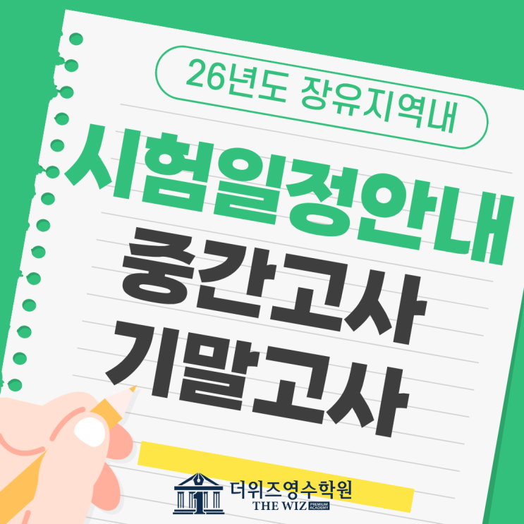 안녕하세요. 더위즈 영수학원 원장 김지효 입니다. 오늘은 2026학년도 장유지역내 중고등학교 학교시험일정을 안내드립니다. 월산중장유중내덕중능동중대청중관동중 장유고삼문고대청고율하고수남고 중간고사 기말고사 시험기간을 안내드려요. 3월 개학과 동시에 학원에서 가장먼저 파악하는 것이 학교 홈페이지의 학사일정이랍니다. 2026년 1학기 주요 시험 일정 1. 중학교 월산중/장유중/내덕중/능동중/관동중/대청중 1학년은 자유학기제로 지필평가가 없고, 2·3학년은 중간고사, 기말고사가 진행됩니다. 2. 고등학교 장유고/삼문고/율하고/대청고/수남고 대부분의 장유지역내 중고등 학교가 4월말 중간고사, 6월말 기말고사 일정을 치르....... <img src="https://blogthumb.pstatic.net/MjAyNjAzMTFfMTMz/MDAxNzczMjM5NTA0Nzcx.0YvWGHRHAATdG7TUUItEFOvlTn_ckyIqFsRrstvM_3Yg.98xA6L7oB8AIqCKp11EcHMxePyMyK2aiQ-z6CdfY33kg.PNG/%C1%A6%B8%F1%C0%BB_%C0%D4%B7%C2%C7%D8%C1%D6%BC%BC%BF%E4._%288%29.png?type=s3" />