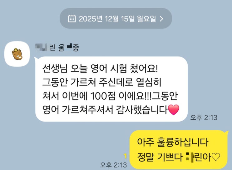 시험 기간이라 학생도, 학부모님도 모두 힘드실 시기인데 오늘 저는 하루를 버티게 해주는 정말 기분 좋은 카톡을 받았습니다. 초등학교 5학년 때 처음 학원에 왔던 아이. 그때도 집은 야음동, 학원과는 꽤 거리가 있었습니다. 그래도 한 번도 빠지지 않고 꾸준히 다녔습니다. 중학교에 올라가면서는 중구로 이사를 가게 되었고, 솔직히 그때는 ‘이제 학원을 그만두겠구나’ 라고 생각했습니다. 처음부터 잘하던 아이는 아니었습니다. 처음에는 지문 읽는 것 자체도 힘들어했고 단어를 외우는 것도 힘들어했습니다 그렇지만 이 아이에게는 분명한 강점이 있었습니다. 하고자 하는 마음 도망가지 않는 성실함 선생님에 대한 믿음 저는 이 태도를....... <img src="https://blogthumb.pstatic.net/MjAyNTEyMTZfMjc3/MDAxNzY1ODYyNzU1ODMy.oWiYFqUePhrN6FErhGwUdai_iQZopObuwVLCtMySCAAg.ClDpEEZK1CEoG-pbngKS26peNAVIjX0kCZ1_hpLmZ-og.JPEG/KakaoTalk_20251216_142503040.jpg?type=s3" />