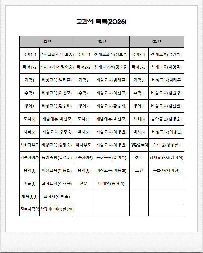 [INFO]봉영여자중학교 2026 교과서 목록