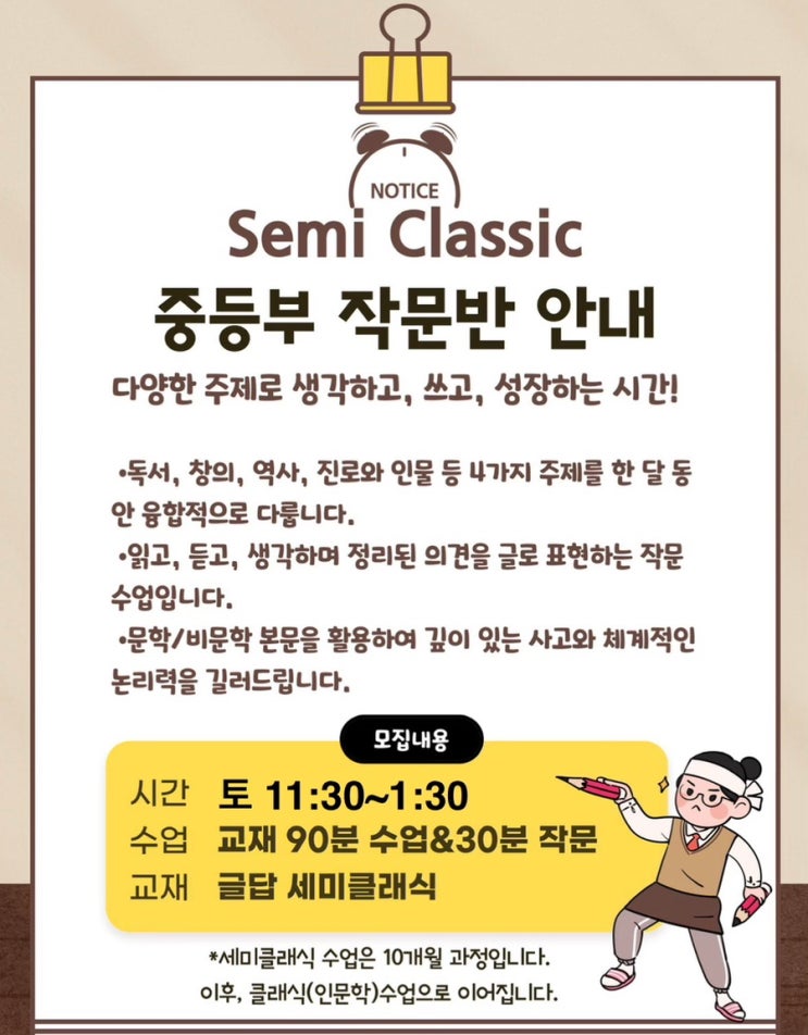 안녕하세요, 생글 논술입니다. 아이들이 중학교에 진학하거나 학년이 올라가면서 학부모님들의 고민도 한층 깊어지곤 합니다. 특히 갑자기 늘어난 '수행평가'와 길어진 '서술형 문제' 앞에서 당황하는 아이들의 모습을 보면 어떻게 도와줘야 할지 막막하실 텐데요~ "우리 아이는 책은 곧잘 읽는데, 막상 글로 쓰라고 하면 첫 줄을 시작조차 못 해요." "머릿속에 생각은 있는 것 같은데, 논리적으로 정리를 못 하네요." 이런 고민을 가진 친구들을 위해, 생글 논술에서 [중등부 작문반 : 세미클래식]을 모집합니다. 단순히 읽고 듣기만 하는 수업이 아닙니다. 요즘 아이들은 미디어에 익숙해진....... <img src="https://blogthumb.pstatic.net/MjAyNjAzMDhfMTIx/MDAxNzcyOTc1Njk4MTA4.5wCKznji306-FKNkJn23fgq4nabxtbLSDaOnd81g2c0g.nMvs9q5Byl0yGO5BHdfn-6Ou_2biJzXKSgFny9YEh-4g.JPEG/IMG%A3%DF9944.jpg?type=s3" />