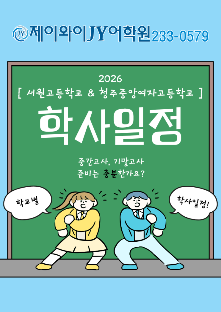 안녕하세요 청주 개신동·가경동 영어학원, 제이와이 JY어학원입니다! 오늘은 저희 학원 고등부 학생들이 재학 중인 청주서원고등학교와 청주중앙여자고등학교의 학사 일정을 간단히 정리해보았어요 ✨ 올해도 살펴보니, 작년과 마찬가지로 청주중앙여고가 다른 학교들보다 전체적인 시험 및 일정이 조금 더 빠르게 진행되는 편이더라고요 ⏰ https://school.cbe.go.kr/seowongo-h/M01/ https://school.cbe.go.kr/cjjang-h/M01/ 그래서 저희 제이와이JY어학원에서는 고등학교 1학년 친구들이 처음 맞이하는 내신 시험에 잘 대비할 수 있도록 고등부 내신 전문 선생님께서 꼼꼼하게 준비 중이랍니다 바쁜 수업 일정 속에서도 학....... <img src="https://blogthumb.pstatic.net/MjAyNjAzMjBfMTEz/MDAxNzczOTgyMTMxODk0.aU50U12mprnjHJrRbjs8XdBCl4LZ0BHsecwH8fZx99Qg.6JwyLmpRUkq8Kxrj5chR2uijW_TgTmL97hw6Cri9_4cg.PNG/1.png?type=s3" />