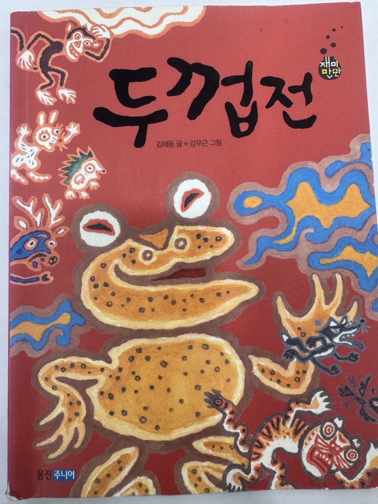 두껍전 김해등 글/ 강우근 그림/웅진주니어 펴냄 1부-호랑이 없는 곳에 내가 왕 2부-내 나이가 더 많소 3부-내가 더 잘났소 4부-얼씨구절씨구 놀아 보세! 등장인물- 노루, 토끼, 노렁 노루, 여우, 두꺼비 옛날 깊고도 깊은 오룡산 시골에 노루 선생의 회갑 잔치가 열렸어. 그런데 노루 선생이 숲속 대왕인 호랑이를 초대하지 않은 거야. 아뿔싸 생각지도 않은 문제가 생기고 말았네. 호랑이 대왕의 자리를 놓고 자리다툼이 벌어진 거야. 아무래도 간사하고 꾀가 많은 여우가 그 자리를 차지할 것만 같아. 그때 볼품없이 생긴 두꺼비가 여우에게 도전장을 내밀었어. 과연 숲속 대왕 자리를 어느 동물이 차지할까? 그리고 포악하기로 악명 높은 호....... <img src="https://blogthumb.pstatic.net/MjAyNjAyMjhfMTA4/MDAxNzcyMjU0MjIyNDMz.CE4CG44wPEg0p1xE2TQTjZh7jl-QNbufze_qa0aSNQQg.pH0g1Xkz1MfbRRJrAELVJNQsJSKYFSbSAjiNnp0NqWAg.JPEG/KakaoTalk_20260228_134609477.jpg?type=s3" />