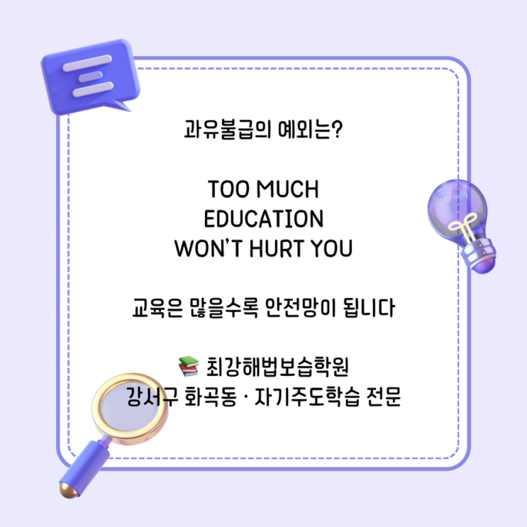 며칠 전 읽은 교육에 관한 영어 지문이 좋아 교육에 대해 생각해 보았습니다. “과하면 독이 된다"라는 말이 있습니다. 하지만 교육은 예외입니다. 해외 연구에 따르면 지식과 배움은 과해도 해롭지 않습니다. 오히려 삶을 지키는 힘이 됩니다. 교육에 관한 Q&A ❓ 교육을 너무 많이 받으면 해로울까요? 아닙니다. 연구에 따르면 교육 수준이 높을수록 건강, 소득, 삶의 만족도가 함께 상승합니다. ❓ 교육이 실제로 삶을 바꾼다는 근거가 있나요? OECD와 세계은행 보고서에 따르면 교육 수준이 높을수록 기대수명과 경제적 안정성이 증가합니다. ❓ 아이에게 과한 학습이 스트레스가 되지는 않을까요? ‘양’보다 중요....... <img src="https://blogthumb.pstatic.net/MjAyNjAzMDJfMjc5/MDAxNzcyNDEzNTc3ODkz.-sghTPYLMgni1qlvqVrOOfAVPljwsNQNRTJuE5CDy3Ag.Bs26GYKI-x2boUINdy2pPGaOH_re1dNNbL4yb1q6uPsg.PNG/%BA%B8%B6%F3%BB%F6_%C8%F2%BB%F6_3D_%BA%ED%B7%CE%B1%D7_%BD%E6%B3%D7%C0%CF_%C0%CE%BD%BA%C5%B8%B1%D7%B7%A5_%C6%F7%BD%BA%C6%AE.png?type=s3" />