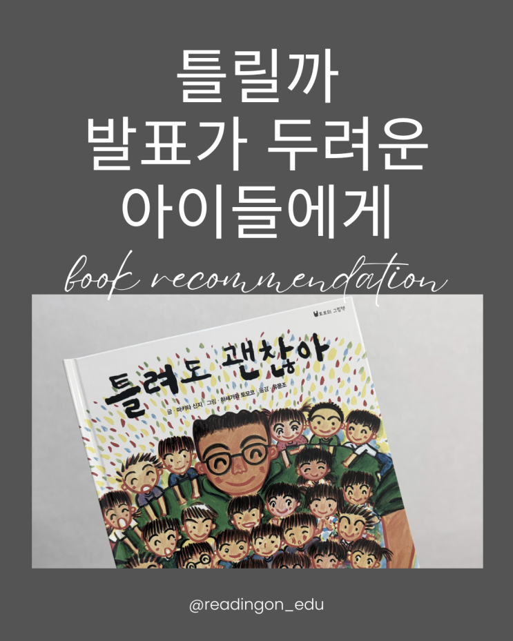틀려도 괜찮아. 그래서 우리는 배웁니다. 친구들 앞에서 틀릴까 봐 발표를 하지 않는 아이들, 생각보다 많습니다. 특히 완벽주의 성향이 강한 아이들일수록 손을 들지 않습니다. 말을 알면서도, 입을 열지 않습니다. “혹시 틀리면 어떡하지?” 그 한 문장이 아이를 멈추게 합니다. 완벽하지 않기 때문에 배우는 겁니다 저는 아이들에게 자주 말합니다. “너희는 완벽하지 않기 때문에 리딩온에서 배우는 거야. 여기서 많이 틀리고 가야, 그게 진짜 너희 것이 돼.” 완벽한 아이는 없습니다. 그리고 완벽한 상태에서는 배움도 일어나지 않습니다. 틀리는 순간, 아이의 뇌는 가장 강하게 기억합니다. 부끄러움이 아니라 성장 신호입니다. 틀릴 수....... <img src="https://blogthumb.pstatic.net/MjAyNjAyMjhfMTYg/MDAxNzcyMjU3MzA5NDE5.wbnFG0Uiv_YTzQ7lWTxtERNMaic9_ozRPa3JDt8-kegg.9x1ztKbvDhe1P2rRehSUXn8vxI-zWMoGBLtoKVJfBHcg.PNG/Readingon.png?type=s3" />