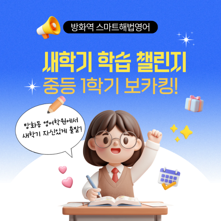 신 학기 성적은 방학 준비에서 결정됩니다. 방화동영어학원 스마트해법영어에서는 겨울방학 마무리로 2026년 1학기 준비를 위한 새학기 학습 챌린지를 진행합니다. 2월 26일(목) ~ 3월 6일(금) ✔️ 중등 영어 1학기 내신 보카킹 ✔️ 초등 영어 모의 진단평가 오늘은 이번 새학기, 방화동학원 선택을 고민하셨던 학부모님들께 체계적인 문법·단어 관리 시스템 소개로 중등 내신 대비 방학특강과 보카킹 소식을 전해드립니다. 이번 챌린지는 단순 방학 마무리가 아닌, 3월 학교 수업 시작과 동시에 바로 내신 대비가 가능하도록 설계되었습니다. 중등 내신 대비 방학 특강 중등부는 방학동안에도 오전 특강 수업으로 학습 리듬을 유지....... <img src="https://blogthumb.pstatic.net/MjAyNjAyMjhfMjE4/MDAxNzcyMjU5MjgzMTg1.E7UZdUv5bUUlfDOvM170v8aWSLKK4pPHHMx1hgoKgyog.3JuQOZof_oOhv418QDZE77iwuJKc5YRHf5Cc9DiSBE0g.PNG/900%A3%DF%B9%E6%C8%AD%B5%BF%BF%B5%BE%EE%C7%D0%BF%F8%A3%DF%C7%D0%BD%C0%C3%A7%B8%B0%C1%F6%A3%DF%C1%DF%B5%EE%BA%B8%C4%AB%C5%B7.png?type=s3" />