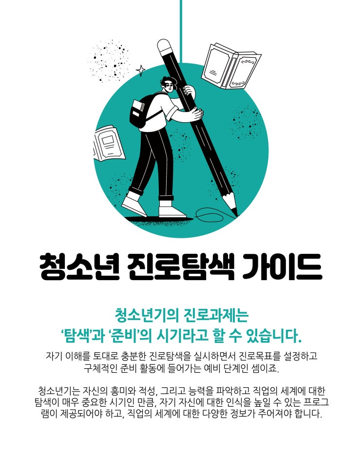청소년 진로탐색 가이드 청소년기의 진로과제는 ‘탐색’과 ‘준비’의 시기라고 할 수 있습니다. 자기 이해를 토대로 충분한 진로탐색을 실시하면서 진로목표를 설정하고 구체적인 준비 활동에 들어가는 예비 단계인 셈이죠. 청소년기는 자신의 흥미와 적성, 그리고 능력을 파악하고 직업의 세계에 대한 탐색이 매우 중요한 시기인 만큼, 자기 자신에 대한 인식을 높일 수 있는 프로그램이 제공되어야 하고, 직업의 세계에 대한 다양한 정보가 주어져야 합니다. 자신의 능력 및 성향을 이해하자 진로 고민에 휩싸였을 때는 먼저 나 자신이 누구인지, 내가 하고 싶은 일은 무엇인지, 내가 잘할 수 있는 일은 무엇인지에 대해 생각할 수 있어야 합....... <img src="https://blogthumb.pstatic.net/MjAyNjAzMjdfMTMy/MDAxNzc0NTk4NDY3OTcx.j2zbmd3lUVehHOCv6cXJusxNFAXWcOUPkxODw5G_k5gg.BdVanJQwiVm4cLOkWEUu4CT-4TGHUsj0teujgIUiSKYg.JPEG/260330_%BF%F9%BF%E4_%C4%AB%B5%E5%B4%BA%BD%BA.jpg?type=s3" />