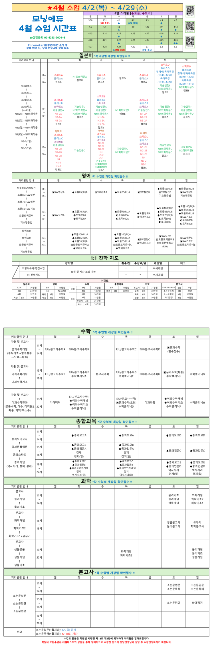 모닝에듀 4월 시간표 & 수강료안내