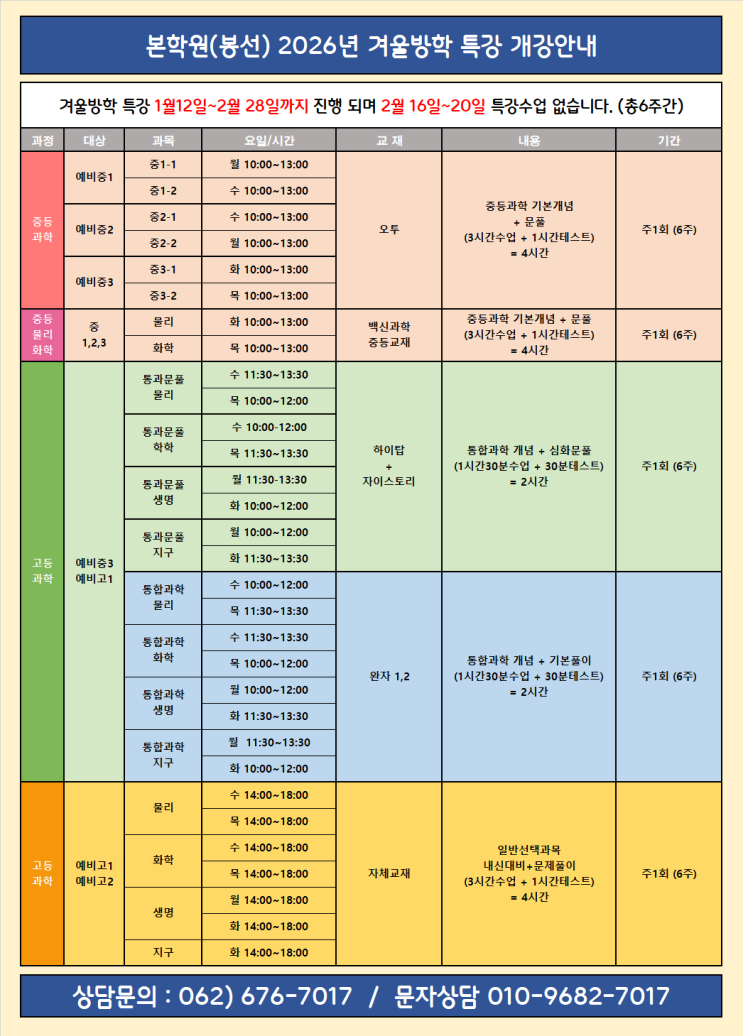 2026년 겨울방학 특강 시간표 입니다. 각 지점별 시간표 확인 하시고 방문접수 또는 전화접수 해 주시기 바랍니다. 선착순 접수로 조기 마감 될수 있으니 서둘러 접수해 주세요^^ [봉선동 시간표] [금호동 시간표] [수완동 시간표] <img src="https://blogthumb.pstatic.net/MjAyNTEyMThfMTc0/MDAxNzY2MDU2NDg0Nzky.yfV4NfAmPAPpc0kug6nXx2DCWM6aQxlvgZO4Mnip5qgg.Gy6V2XkK8GK5ZMuzqpMJRmL3JpSdm1Xeg6Yqi9wX2cQg.PNG/%BA%C0%BC%B1.png?type=s3" />