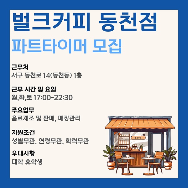 안녕하세요. 광주커피바리스타학원입니다. 벌크커피 동천점에서 파트타이머를 구하고 있어 안내 해 드리겠습니다. 근무요일 및 시간은 월화토 17:00-22:30 입니다. (마감) ✅업무내용: 음료제조 및 판매, 손님응대 ✅지원조건: 성별무관, 연령무관, 학력무관 ✅우대사항: 대학 휴학생 오래 함께하실 분 환영합니다. 구인공고 관심 있으신 분들은 위 공고 클릭해서 내용 확인 후 온라인지원, 간편문자지원 하시면 됩니다 :) 빠르게 마감될 수 있으니 서두르시기 바랍니다~ <img src="https://blogthumb.pstatic.net/MjAyNTEyMTlfNTQg/MDAxNzY2MTI4NDU5MDc4.T8aAaNmklkV1q3RJlzhEcfRthHeDhPmMyAtVXIxWUh8g.n7zukMJ4eZM-6jezubxSnwNG_TTK2qJiO3ABACMNUl0g.JPEG/%C1%A6%B8%F1%C0%BB-%C0%D4%B7%C2%C7%D8%C1%D6%BC%BC%BF%E4_-001.jpg?type=s3" />