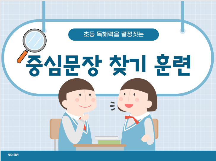 안녕하세요. WAY 학원입니다. 오늘은 독해력을 향상시킬 수 있는 '중심 문장 찾기' 훈련법에 대해 포스팅해 보겠습니다. 중심 문장 찾기 왜 4학년일까? 4학년 국어 교과서를 펼쳐보면 이전보다 지문이 부쩍 길어진 것을 느끼실 거예요. 이때 아이들이 가장 많이 하는 실수가 '다 읽었는데 무슨 내용인지 모르겠어요'라고 하는 것이죠. 글 전체의 내용을 꿰뚫는 중심 문장을 찾는 능력은 단순히 국어 문제를 맞히기 위함이 아니라, 정보를 요약하고 핵심을 파악하는 '공부머리'의 기초가 됩니다. 오늘은 집에서 10분만 투자하면 독해력이 달라지는 연습법을 소개해 드릴게요. '이것'만 기억하세요 먼저 중....... <img src="https://blogthumb.pstatic.net/MjAyNjAzMTNfMTc5/MDAxNzczNDAwODg2MzUy.JvCgayhXkIpXrpKB_yKzsJB4k8mjng80PB1Y5WBLhYcg.V9TouWG6cS_UuraAUaAqL6DxigwDQ_KXmF5iAExg7nkg.PNG/%C4%B8%C3%B3.PNG?type=s3" />