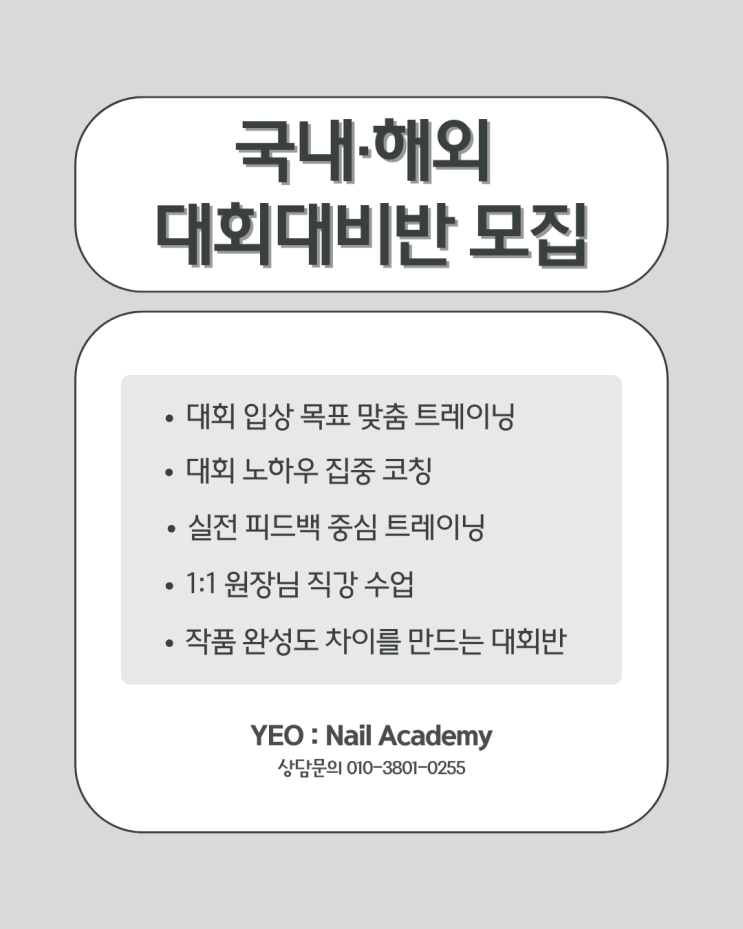 안녕하세요 #울산네일전문학원 #여_울산네일전문학원 입니다 비가 그치고 나니까 날이 포근해진 거 같아요^ 3^ 아직 일교차는 커서 감기 걸리지 않게 조심하시고 즐거운 주말 보내세요~~~♡ 네일 실력을 한 단계 더 성장시키고 싶다면 대회 출전은 선택이 아닌 필수 과정입니다 국내뿐 아니라 해외 대회까지 체계적으로 준비할 수 있는 국내·해외 대회대비반을 소개합니다♡ ♣ 대회대비반이 필요한 이유 대회는 단순한 작품 제작이 아닌 기술력, 완성도, 시간 관리, 표현력까지 평가되는 전문 무대입니다 혼자 준비할 경우 방향을 잡기 어렵고, 심사 기준을 정확히 이해하지 못해 좋은 결과로 이어지기 힘듭니다 대회대비반에서는 실제 심사 기....... <img src="https://blogthumb.pstatic.net/MjAyNjAzMjBfMjY0/MDAxNzczOTc3Mzk5NTE3.IYOCSrb-fSzSmRoK7Zgd30x7ZcFdDq2jLoCPHUqWgZgg.uf5wLUsx__EcFZLPMvMEDVSVuuW64RdMh5O-wX49bbYg.PNG/image.png?type=s3" />