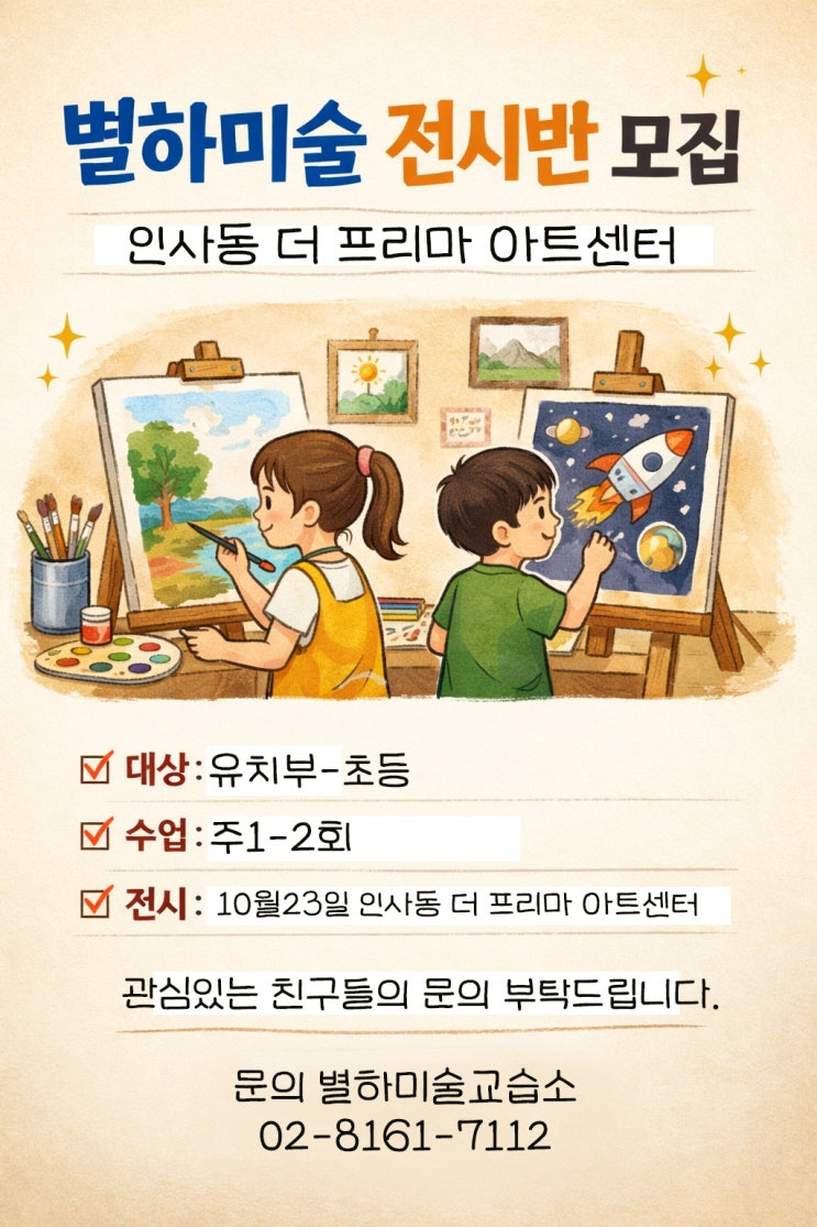 별하미술 전시반 모집 안내 안녕하세요, 별하미술입니다. 2026년 10월 인사동 더 프리마 아트센터에서 진행되는 별하미술 제2회 작품전시회를 준비하며 전시반을 모집합니다. 전시반은 전시를 목표로 작품을 완성하며 아이들이 한 작품을 깊이 있게 표현하고 전시 경험을 통해 성취감과 자신감을 느낄 수 있도록 지도합니다. ✔ 대상 : 유치부/초등학생 ✔ 수업 : 주 1~2회 전시 작품 제작 ✔ 전시 : 2026년 10월 / 인사동 더 프리마 아트센터 전시에 관심 있는 친구들은 문의 부탁드립니다. 아이들의 소중한 작품이 반짝일 수 있도록 정성껏 지도하겠습니다. 별하미술 드림 <img src="https://blogthumb.pstatic.net/MjAyNjAzMTNfNTgg/MDAxNzczMzc3OTIxNDEy.ztbNqjHOoxzxNtEW3B9cVbOWX3_EZeLA6AB5nCk-q_wg.JVJI3r7PYys5fbmyUJB1ADFGby3o7ktiZG6CLucGeogg.JPEG/943c1939-5332-4658-9b30-3e0c62e784f9_%281%29.jpg?type=s3" />
