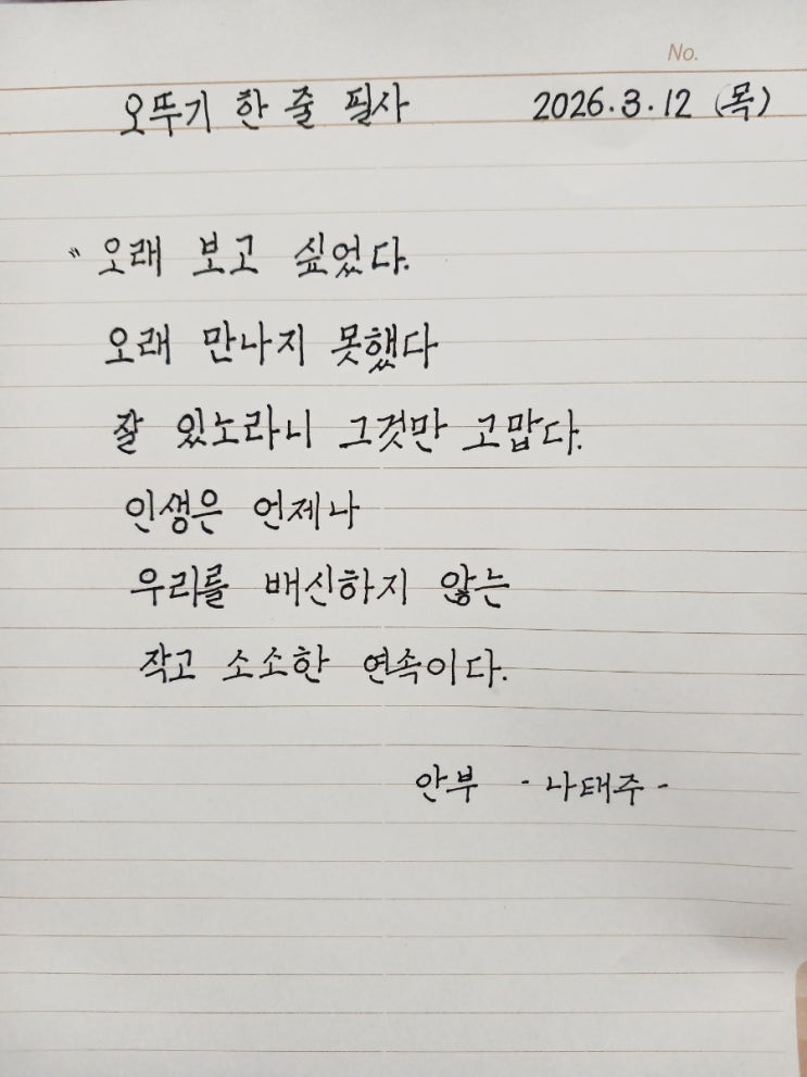 "나태주 시인의 시는 참 신기합니다. 특별한 수식어가 없어도 읽는 것만으로 마음이 몽글몽글해지거든요. '잘 있노라니 그것만 고맙다'........ 각자의 자리에서 오늘 하루 잘 머물러 주는 것, 그것만으로도 누군가에게는 충분히 고마운 우리들입니다. #나태주 #안부 #시필사 #마음챙김 #오늘의기록 #위로가되는시 #잘있노라니그것만고맙다 <img src="https://blogthumb.pstatic.net/MjAyNjAzMTJfNTIg/MDAxNzczMjY3NzM2MzY4.gsZK9FCMpHmxyr2azx16ifvLdrdHUGF-XB0CGXaZo-4g.9ry_9JoWsAuwv26Wd7YAgUgqtyaFlNtZgEprU6W4e2Qg.JPEG/900%A3%DF20260312%A3%DF064443.jpg?type=s3" />