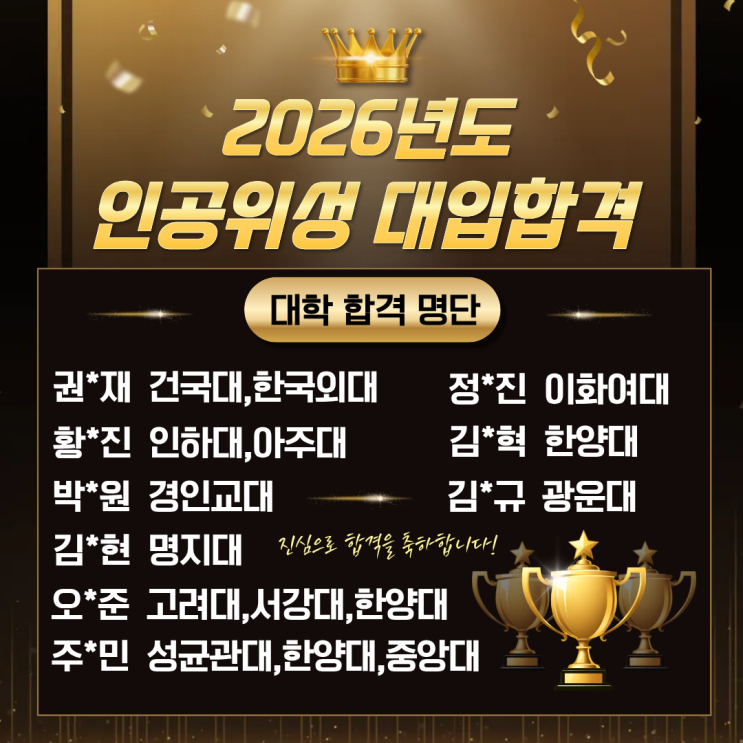 인공위성 아이들의 2026년 대입 합격 통지서 2026 대입 결과 분석 안양 평촌 인공위성 영어학원이 만든 입시 전략의 힘. 2026학년도 대입이 마무리되었습니다. 올해 우리 학원은 단순한 "합격 소식"이 아닌, 입시 전략의 방향성이 맞았다는 결과를 확인했습니다. 2026 대입 결과 한눈에 보기 ✅ 권*재 - 건국대학교 / 한국외국어대학교(자유전공학부) ✅ 김*규 - 광운대학교 ✅ 김*현 - 명지대학교 ✅ 김*혁 - 한양대학교 ✅ 박*원 - 경인교육대학교 ✅ 오*준 - 고려대학교 / 서강대학교 / 한양대학교 ✅ 정*진 - 이화여자대학교 ✅ 주*민 - 성균관대학교(소프트웨어학과) / 한양대학교(영어교육학과)/ 중앙대학교 ✅ 황*진....... <img src="https://blogthumb.pstatic.net/MjAyNjAyMjVfNzMg/MDAxNzcyMDAwMTU3NTA2.KczhoOUZ3mSsmsXSxCc-oTFTyNQuaTuKrVMLRAICRAMg.GdIv5b5IuXLYaxYp8MoMsn8upnjYx_A7Rhbtu7q5gYgg.PNG/%C1%A6%B8%F1%C0%BB_%C0%D4%B7%C2%C7%D8%C1%D6%BC%BC%BF%E4._%281%29.png?type=s3" />