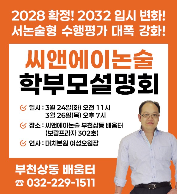 안녕하세요~ 씨앤에이논술 부천상동 배움터입니다! 변화하는 입시 정책에 대비한 2026년 입시 설명회를 준비했습니다. 초·중등 전 학년을 대상으로 하며 비재원생 학부모님들도 신청 가능합니다. *^^* - 2028-2033 입시 대변화 - 2025 내신 5등급제 적용 - 2028 통합 수능 실시 - 중등 국어 내신 대비 - 2033 (현)초6학년부터 대대적인 입시 변화 예고 독서·토론·논술 수업의 중요성 신수능 및 내신의 대변화 특목고+일반고 수행평가 강화 서술형·논술형 내신 수능 준비 서울대+의대 구술 면접 대비 공간 수용 인원의 제한으로 사전 신청을 통해서만 참여가 가능하오니 참여를 원하시는 분은 아래 링크를 통해 신청 부탁드립니다. (전화 또는 문....... <img src="https://blogthumb.pstatic.net/MjAyNjAzMTJfNjkg/MDAxNzczMjgxODM2NDM0.SFgo_SkvCeFETL5XY8GeOUDtu3danXBlhZ874A5NQYog.JlJtU8ID7ViuavRt6lN5b37yN7vLmEhy00dvVb_c-aYg.JPEG/%BC%B3%B8%ED%C8%B8.jpg?type=s3" />