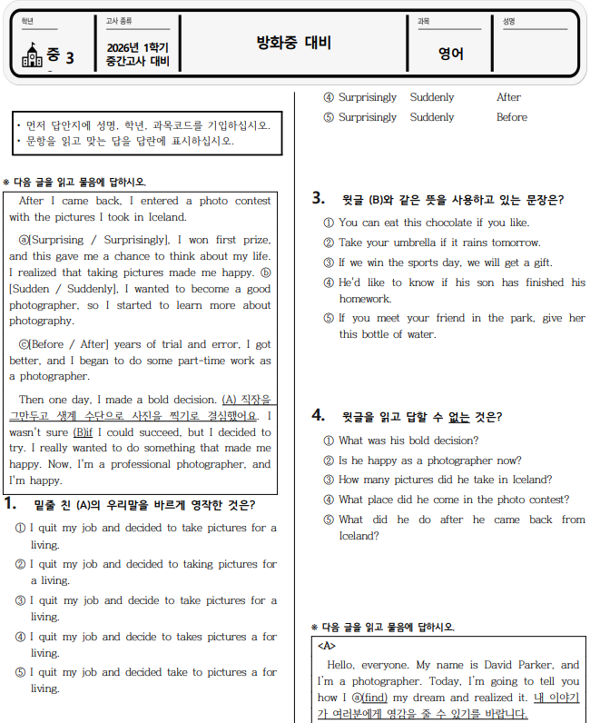 (강서구 중학교 1학기 중간고사 영어 ) 내신 대비반 4월 2일 개강