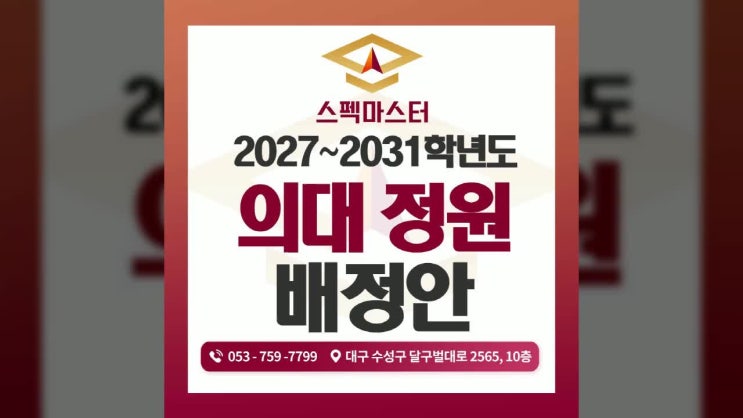 대구 의대 입시컨설팅 스펙마스터 대입전략학원에서 2027학년도부터 2031학년도까지 의대 정원 배정안과 우리 학생들의 성공적인 대입을 위한 본원의 프로그램을 안내해 드리도록 할게요. 2027학년도~2031학년도 의대 정원 배정안 2026년 3월 13일 금요일, 교육부가 2027학년도부터 2031학년도까지 적용될 의과대학 정원 배정안을 사전 통지하면서, 향후 의대 입시 환경에 큰 변화가 예고되고 있어요. 이번 발표는 단순한 정원 확대를 넘어 지역 의료 격차 해소와 필수 의료 인력 확보라는 정책적 목표가 반영된 중요한 전환점으로 평가됩니다. 이번에 사전 통지된 의대 정원은 보건복지부가 통보한 증원 규모를 기반으로 산정된 것으로, 향후 의....... <img src="https://phinf.pstatic.net/image.nmv/blog_2026_03_19_1280/7DAX8TI1mU_01.jpg?type=f480x480" />