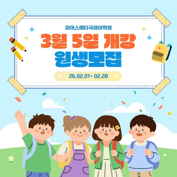 안녕하세요. 아이의 영어 첫 시작을 가장 중요하게 생각하는 파머스메타국제어학원입니다. 새 학기를 맞아 영어를 처음 시작하는 친구들을 위한 파닉스 신규반을 모집합니다. 영어는 시작이 무엇보다 중요합니다. 단순히 알파벳을 외우는 수업이 아닌, 소리부터 정확하게 익히고 읽기와 말하기의 기초를 탄탄하게 만드는 과정으로 진행됩니다. 3월 파닉스 신규반 안내 모집기간: 2026년 2월 1일 ~ 2월 28일 개강일: 2026년 3월 5일 수업시간: 매일반 오후 2:30 ~ 3:25 정원: 8명 소수정예 대상: 영어를 처음 시작하는 초등 저학년 ✔ 파머스메타 파닉스가 다른 이유 1. 한국 선생님 담임제 운영 아이의 학습 상황과 성향을 세심하게 관리합....... <img src="https://blogthumb.pstatic.net/MjAyNjAyMjVfMjQ0/MDAxNzcyMDA3NjA4NTYy.DXEcIvXHElLBsqUzNZI9RVupfmAsUNV0lEN_LIUtCBIg.4SoEupZVGhekFkmto3h-LcY9D3xHax_W-uJ5hbmKzwwg.JPEG/1.jpg?type=s3" />