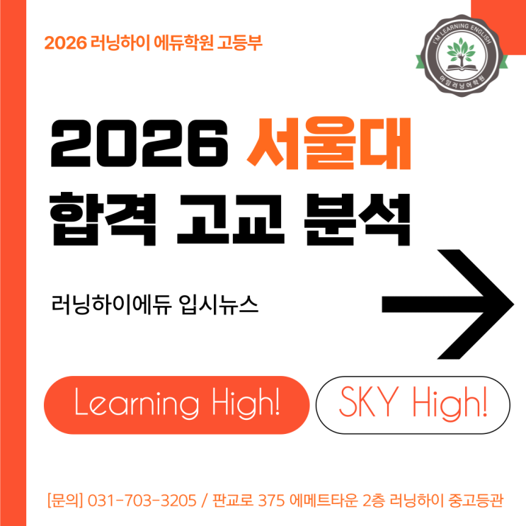 2026 서울대 합격 고교 분석 “의대 정원 원복 + AI 열풍”이 만든 새로운 입시 흐름 안녕하세요? 러닝하이 에듀학원 고등부입니다. 최근 발표된 2026학년도 서울대 합격 고교 분석 결과를 보면 중요한 변화가 하나 보입니다. 바로 의대 정원 원복 + AI 산업 열풍 서울대 공대 및 이공계 지원 증가 이 두 가지 흐름이 동시에 나타났다는 점입니다. 그 결과 서울대 지원이 특정 상위 고교와 교육특구 중심으로 더욱 집중되는 현상이 확인되었습니다. 오늘은 입시 전문가의 관점에서 2026 서울대 합격 고교 분석과 앞으로의 입시 전략을 정리해보겠습니다. 1️⃣ 2026 서울대 합격자 TOP 고교 정시 추가합격까지 모두 반영한 최종 서울대....... <img src="https://blogthumb.pstatic.net/MjAyNjAzMTRfMTgz/MDAxNzczNDc0NjU1MDQ1.0JFWX2fwXANn-H4mbr10gMq_o9PGQ7j3BDsZ5le0AGYg.bh0Sy8_xQAF082Tkwh_bJoY7_nik8Ftmqs1y2Akmgu8g.PNG/%B7%AF%B4%D7%C7%CF%C0%CC_%BA%ED%B7%CE%B1%D7-008_%283%29.png?type=s3" />
