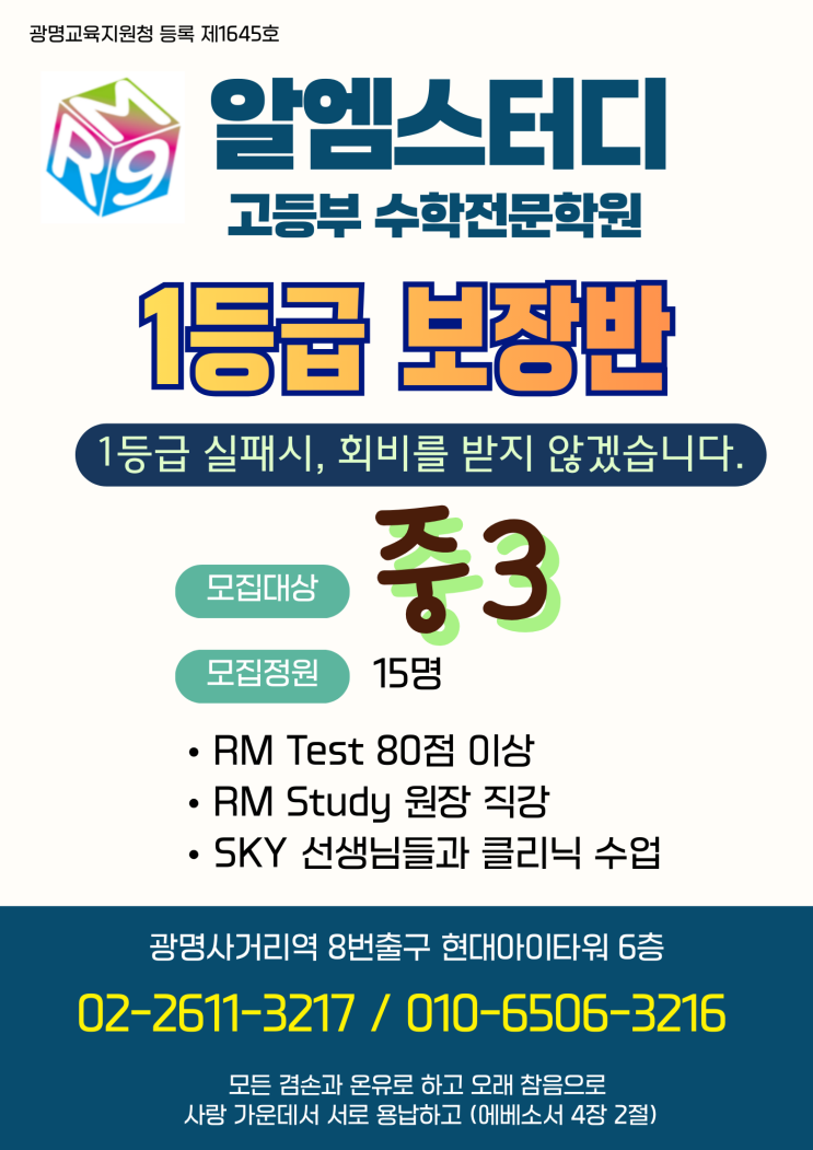 알엠에서 1등급 보장반을 모집합니다. 중학교때 공부 좀 했다 해도, 고등학교때 고등과정을 시작하면 중학교때에 비해 공부 할 것이 2배, 3배 늘어나는 고등학교에서 상위권을 유지할 수 없습니다. 그래서 미리미리 공부하고자 하는 예비고1을 모집합니다. 소수정예만 테스트를 통해 선발합니다. <img src="https://blogthumb.pstatic.net/MjAyNjA0MjlfMjY0/MDAxNzc3NDYzNjI4NzU3.CHV-hq-G607jyQVT2F_g7QFAZaQ2oDbGMCLNVTOiNu0g.8fkOhsoVNxfsUat-s-bQvK9rG0VDMf-M24HOimqp4IAg.PNG/KakaoTalk_20260429_205230675.png?type=s3" />