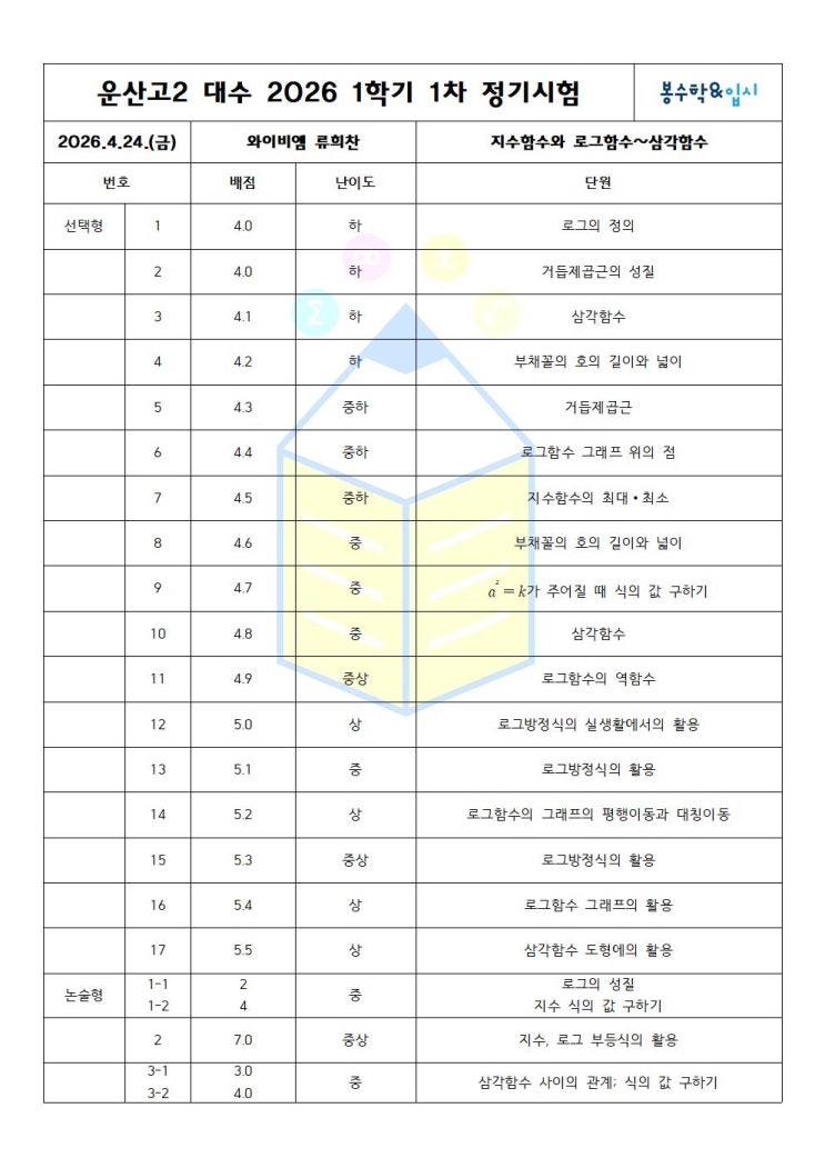 [봉수학] 운산고 2학년 대수 2026 1학기 1차 중간고사 분석지