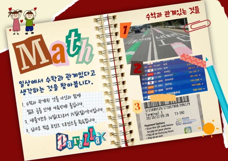 연휴 동안 여행을 간다는 상상을 하면서 고속도로의 노면 색깔 유도선, 공항운항정보시스템, 주차권의 바코드가 선과 색깔의 규칙, 표로 정리, 굵기가 다른 흑백 막대와 숫자로 암호화하는 것이 수학과 관계가 있음을 설명해주고 주말 동안 주변에 어떠한 것이 수학과 관계가 있는지 생각해 볼 수 있는 시간을 가지게 하려 합니다. <img src="https://blogthumb.pstatic.net/MjAyNjAyMTJfMTAx/MDAxNzcwODkwNTI0ODcz.lgRTGmFZibvnA8qhx_j2OsrII9qJjNML264TRKGxhAMg.fEXq3UUaglPhMI4RExZgd0VCd5jlSQ1LTbW-_zphCkog.JPEG/%C1%A6%B8%F1%C0%BB_%C0%D4%B7%C2%C7%D8%C1%D6%BC%BC%BF%E4..jpg?type=s3" />